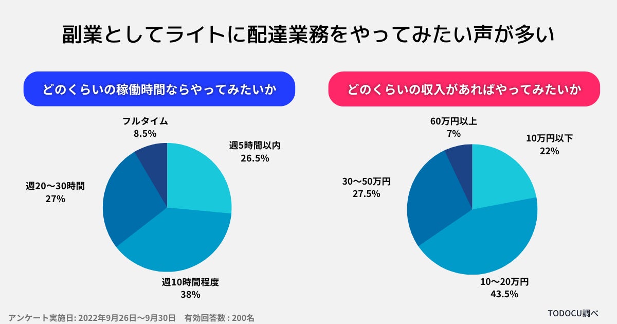 本調査では、オンライン上でのアンケート調査を使用して2022年9月26日〜9月30日までの期間において、「軽乗用車で配達ができるならやってみたいですか?」についてのアンケートを1,000名、「お持ちの軽乗用車でどんな条件なら配送をやってみたいですか?」についてのアンケートを200名に対して調査を実施。