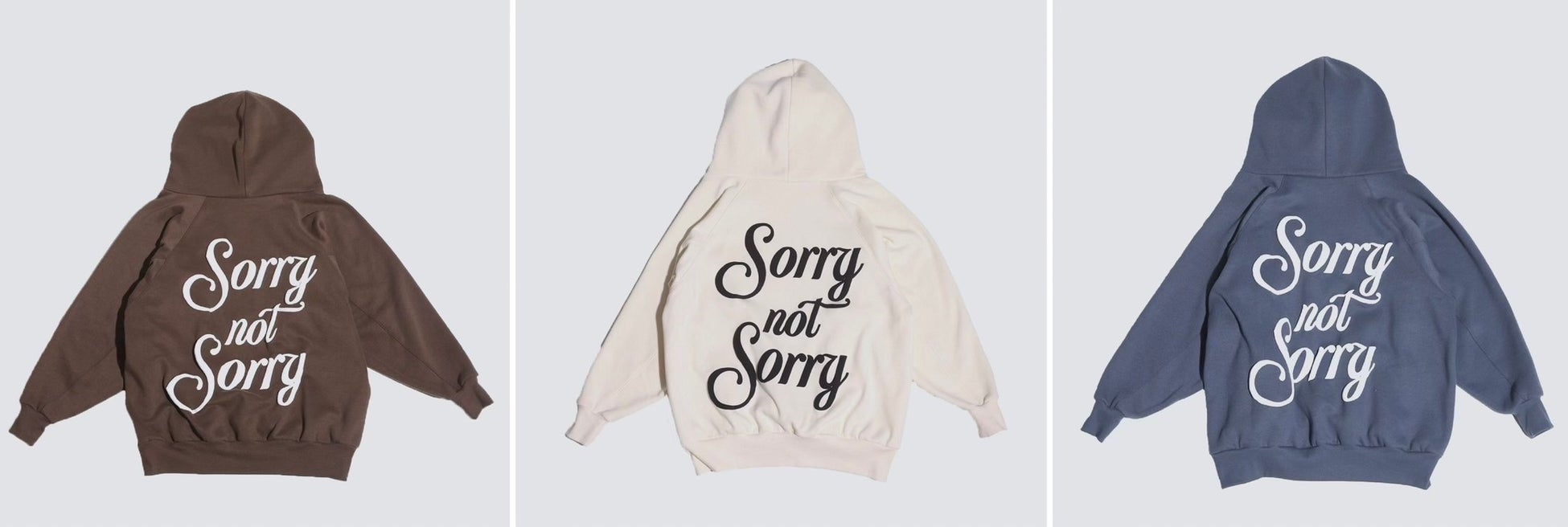 バックプリントには彼女たちが自作した歌詞の「Sorry Not Sorry」(意味:おあいにくさまだけど、まったく悪いと思っていない)が発泡プリントで表現されており、ぷっくりとしたロゴがかわいいデザイン。
