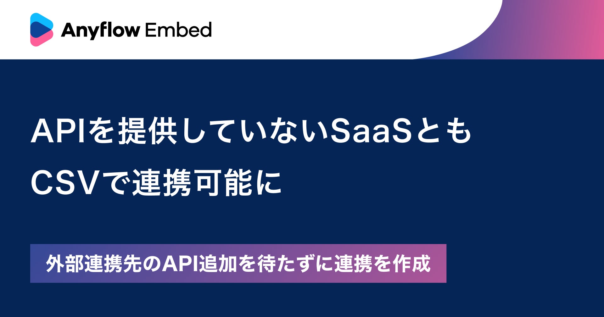 Anyflow株式会社(本社:東京都千代田区、代表取締役CEO:坂本 蓮、以下Anyflow)は、SaaS事業者向けのAPI連携プラットフォーム「Anyflow Embed」について、外部連携先のデータをCSVで取り込む機能をリリースしたことをお知らせします。