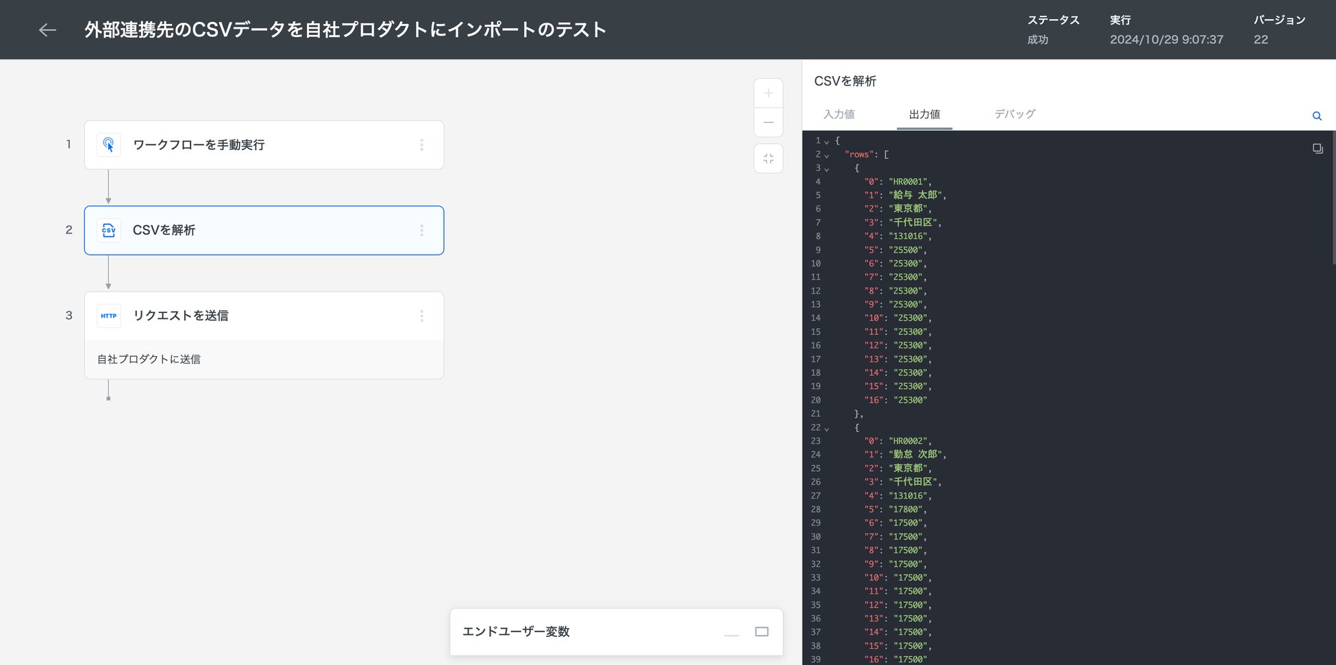 この配列データを自社プロダクトに送信することでインポート処理を実施できます。