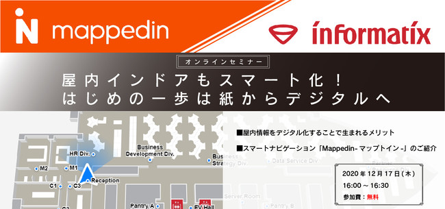 株式会社インフォマティクス(本社:川崎市、代表取締役:齊藤 大地)は、2020年12月17日(木)に屋内案内システム「Mappedin-マップトイン-」のウェビナーを開催することを発表いたしました。