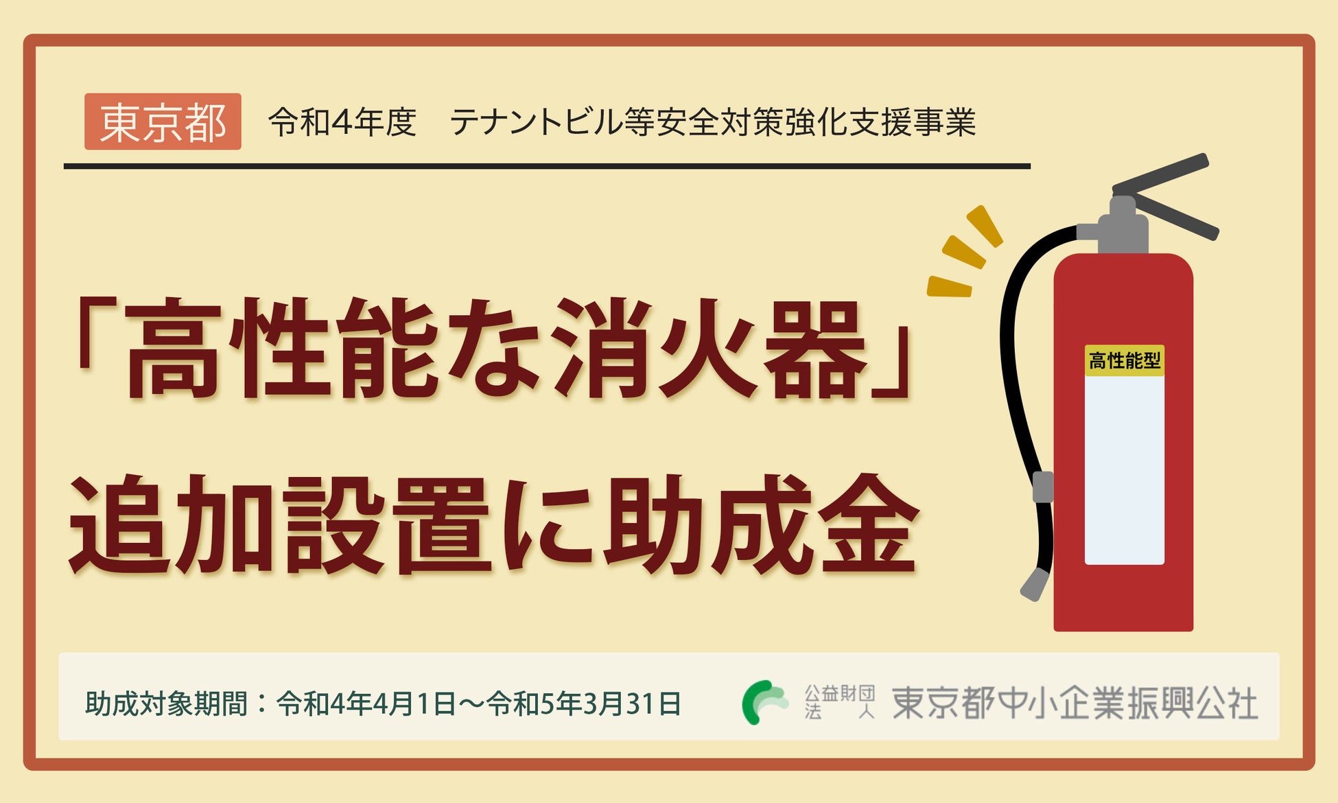 公益財団法人 東京都中小企業振興公社(本社:東京都千代田区、理事長:目黒 克昭)は、都内の中小企業者等を対象に、火災の初期対応を着実に実施するための「高性能な消火器」の導入に係る経費の一部を助成する「テナントビル等安全対策強化支援事業」の電子申請を5月31日(火)から受け付けます。