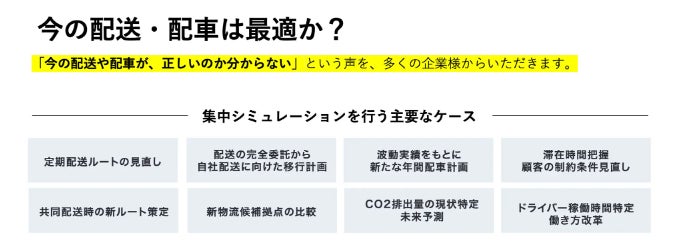 ルート再編余地、顧客制約条件の見直しなど様々なケースにお応えすべく、専門スタッフが最短1か月から、集中的にシミュレーション・レポートを行うサービスです。