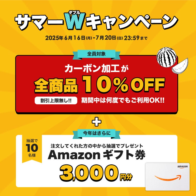 さらにお客様に日頃の感謝の意を込めて、6月16日(月)より全商品10%OFFになるサマーWキャンペーンを開催中です。キャンペーン期間中にご注文いただいたお客様の中から、抽選で10名様に3,000円分Amazonギフト券プレゼント。