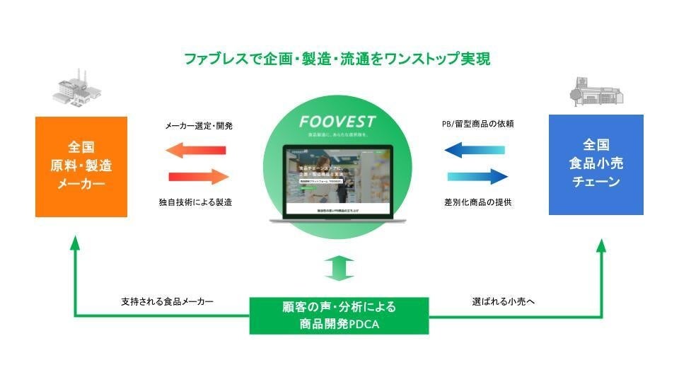 「FOOVEST(フーベスト)」は、国内約45兆円のマーケット食品小売市場において、2022年3月から本格スタート。食品小売企業の売り場の差別化(独自MDの強化)、製造メーカーの新たな商品フォーマット・販売チャネル拡大を支援する事業を行っています。