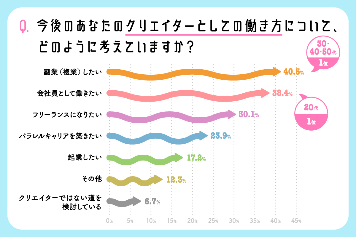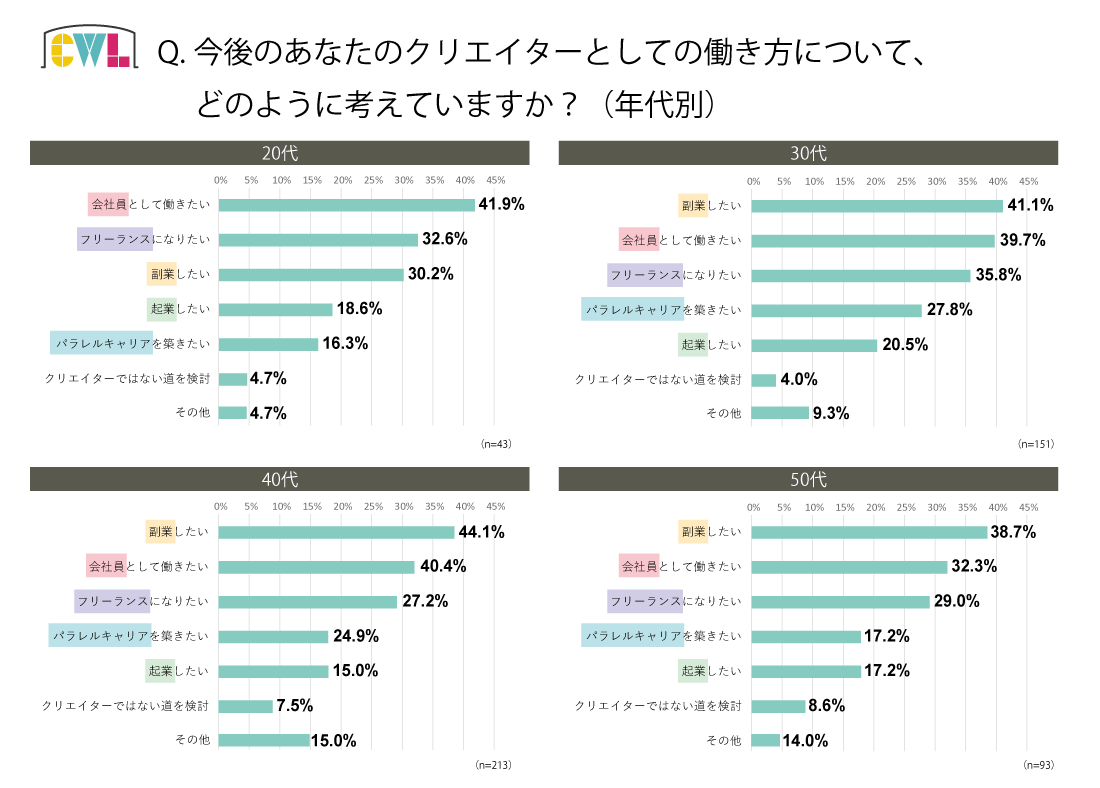 クリエイターワークス研究所『クリエイターの働き方実態調査⑧』続編を発表。【年代別比較】クリエイターのこれからのキャリア。みんなどう考えている?20代は『会社員』、30代以降は『副業』がトップに。