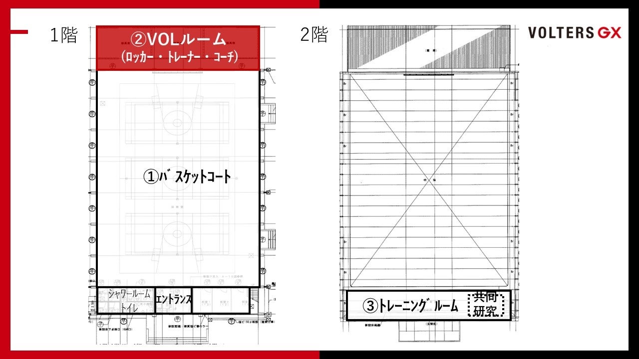「VOLTERS GX」はバスケットボールコート1面(ゴールリング6其)、選手ロッカー、ケアルーム、コーチルーム、トレーニングエリア、共同研究室を完備