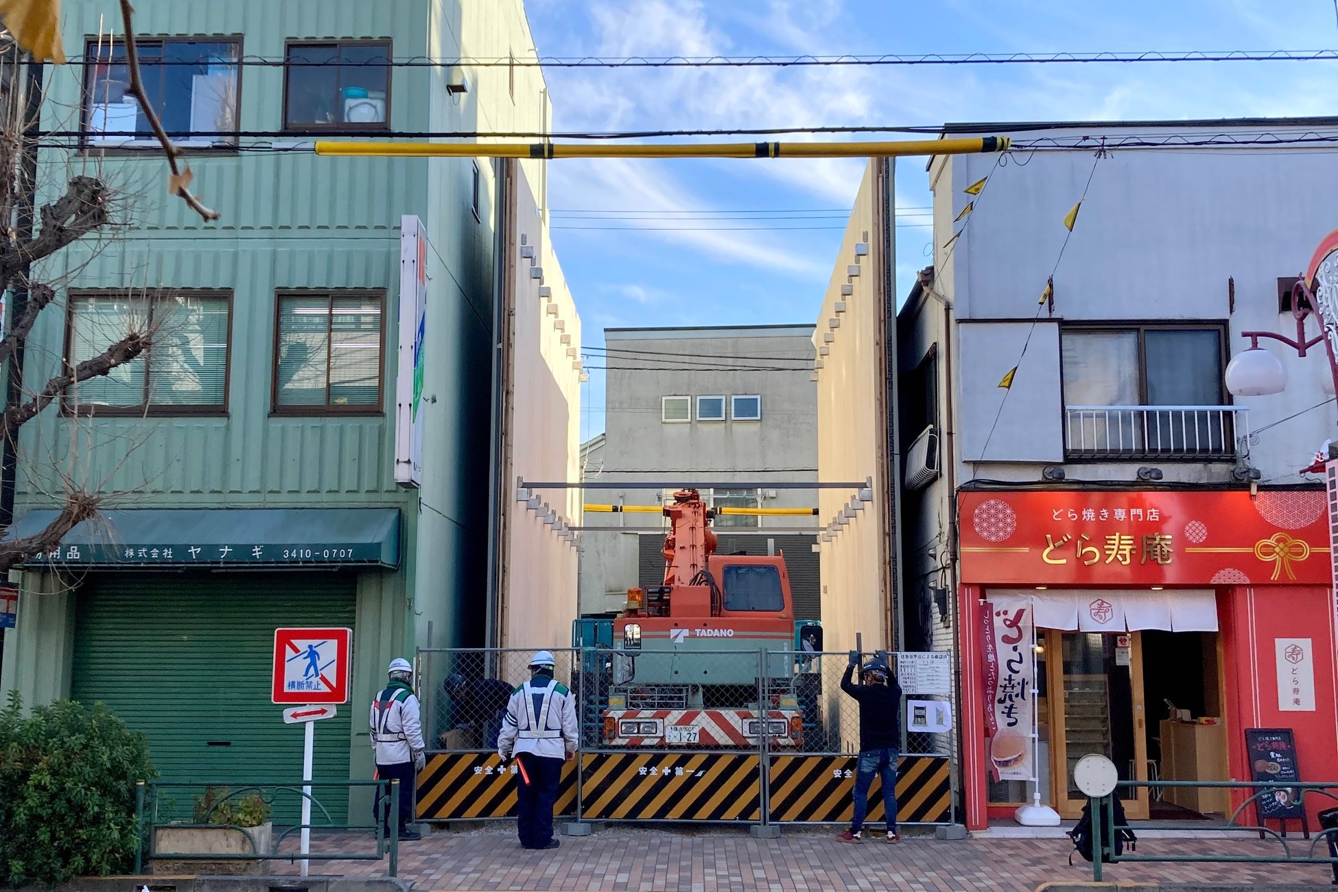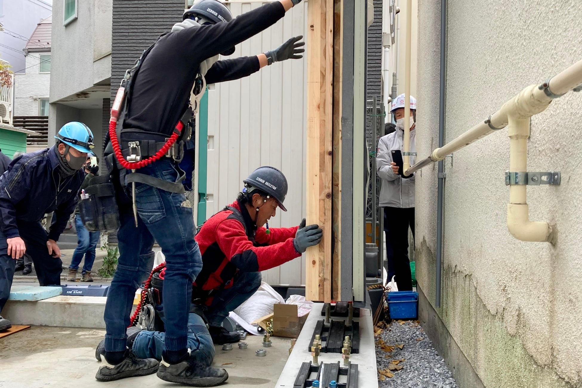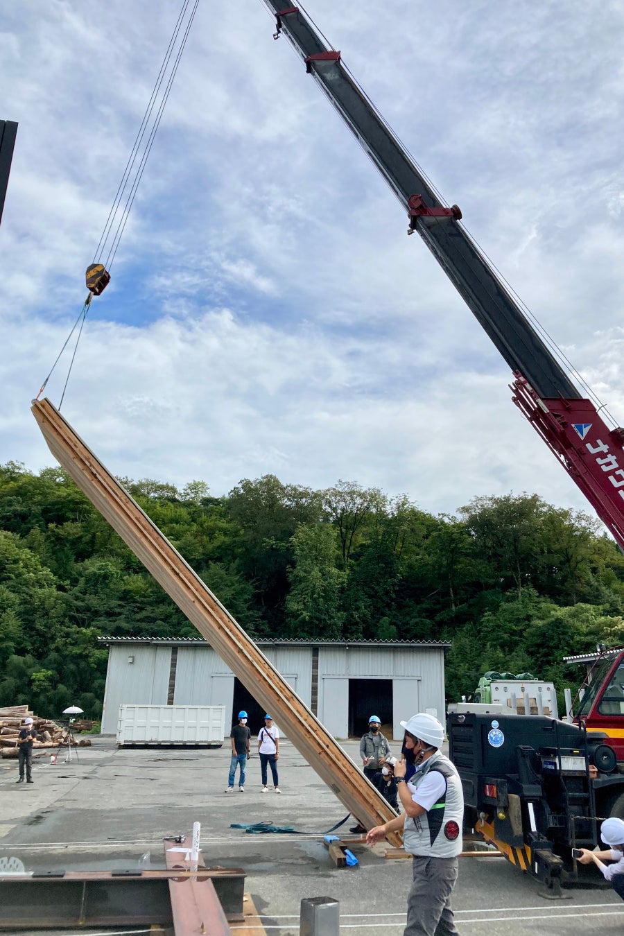 建て方は2023年1月17日(火)〜1月23日(月)の7日間で終了いたしましたが、今回の建て方は①道路の占有許可が各日6時間であること。②時間に幅を持たせた工程を組むこと。という条件下で実施したため、事後検証の結果、最短4日間での建て方が可能な工法であることが実証できました。