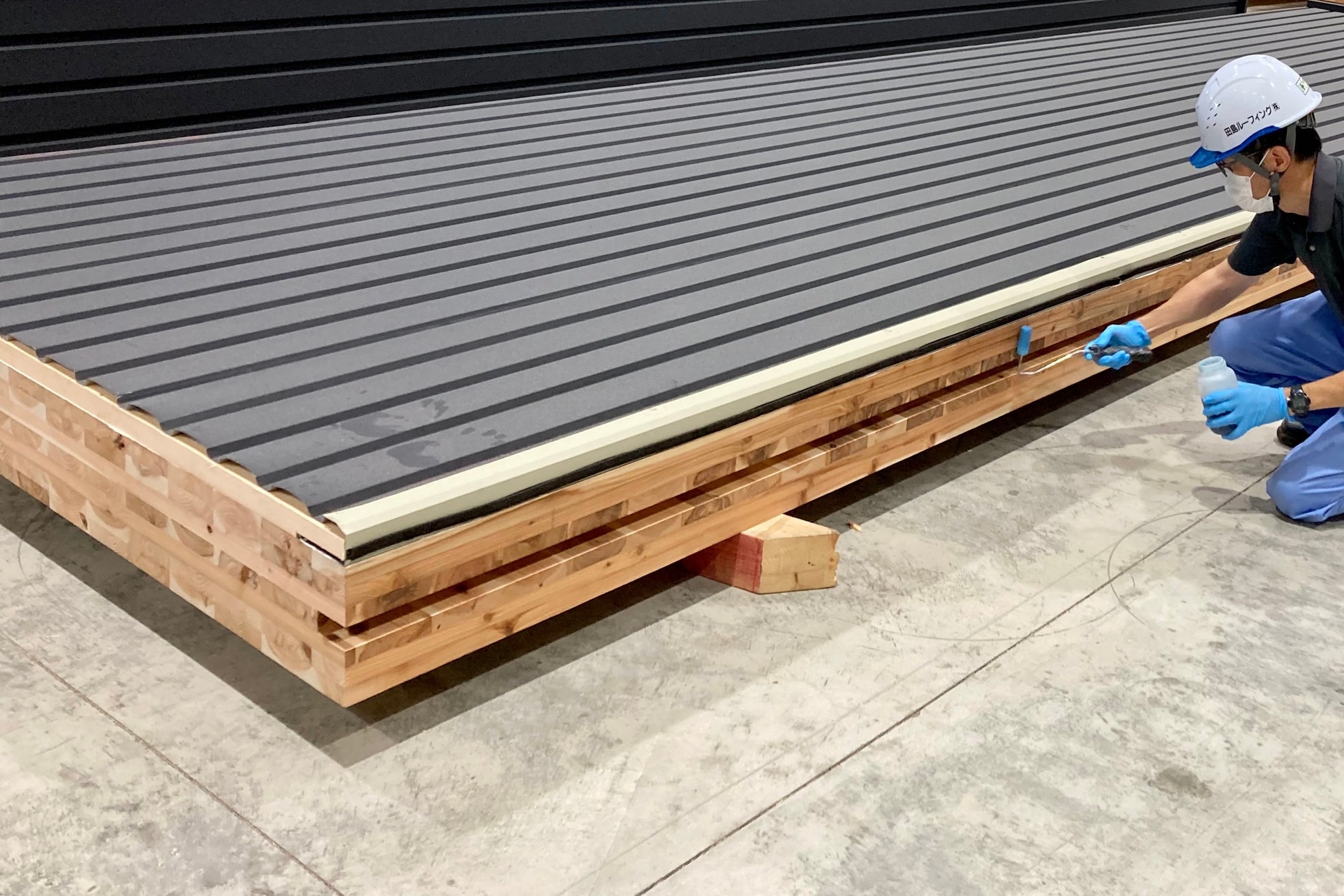 都市部狭小地でのオフサイト製造は、建て方後に外壁施工の確認やメンテナンスが出来ないことが課題です。そのため、事前に実寸大のCLTパネルを用いて、工場でプレセットしたCLTの外壁の防水性を検証いたしました。