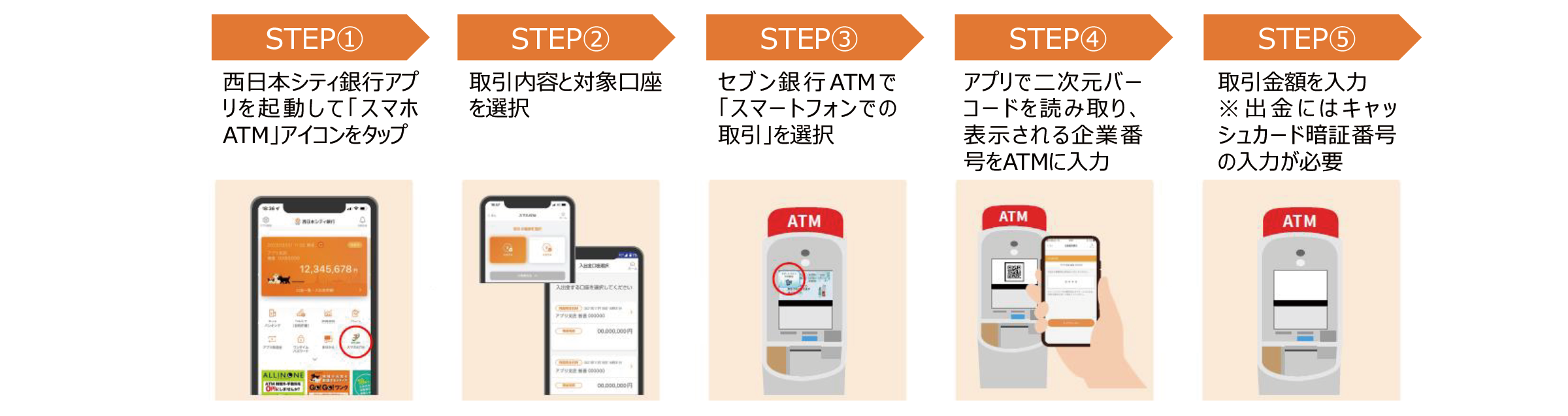 本サービスは、西日本シティ銀行アプリで、セブン銀行ATMに表示された二次元バーコードを読み取り、スマホ画面に表示された企業番号、キャッシュカードの暗証番号をセブン銀行ATMに入力することで、キャッシュカードが手元になくてもセブン銀行ATMで現金の入出金取引ができます(詳細については、「3.ご利用の流れ」をご参照ください)。