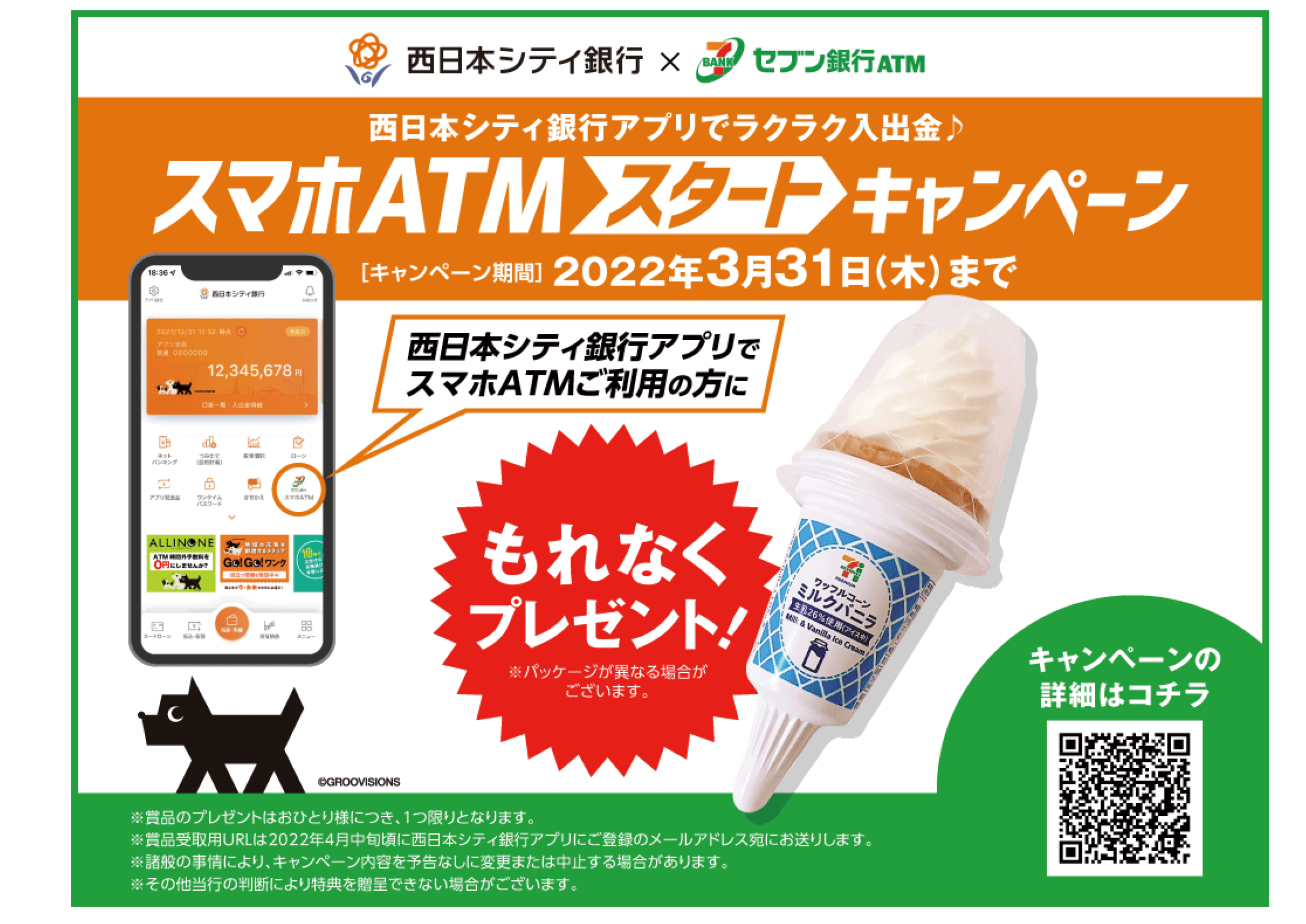 また、2022年2月7日から2022年3月31日の間に本サービスをご利用いただいたお客さま全員にもれなく、セブン・イレブンの店頭で"セブンプレミアム ワッフルコーン ミルクバニラ"をプレゼントする「スマホATMスタートキャンペーン」を実施しますので、この機会に是非ご利用ください。