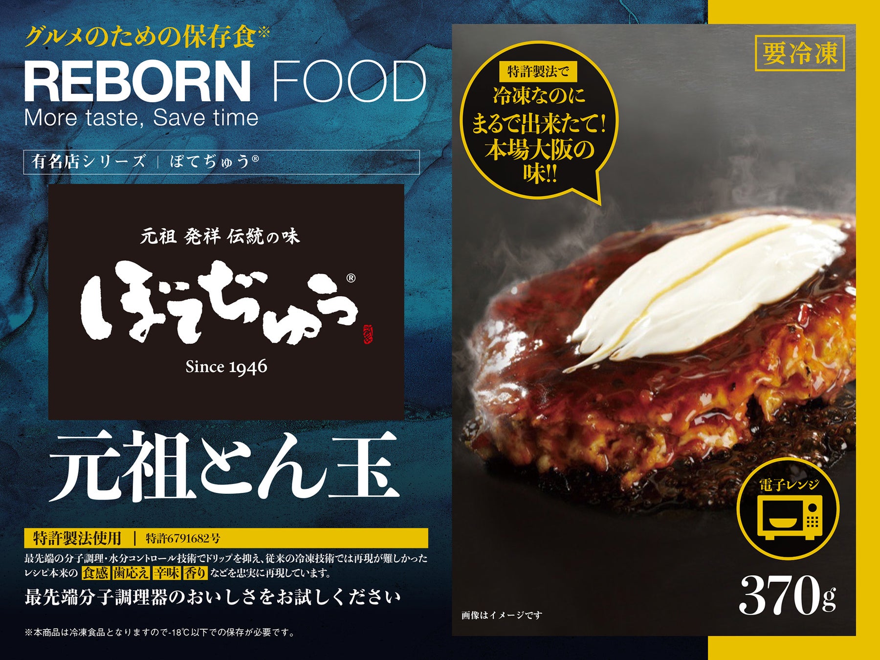 1946年に創業したお好み焼専門店の老舗「ぼてぢゅう®」を運営する「ぼてぢゅう®グループ」(大阪府大阪市、代表取締役社長:栗田英人、以下「当社」)は、株式会社エバートロン(東京都港区、代表取締役社長:嶋根一弘、以下「エバートロン」)が独自開発した「W.O.W Freezer」凍結機など水を極小整列化する技術を活用し、自社商品のお好み焼「元祖 とん玉」の進化系冷凍食品を製造いたしました。「グルメのための保存食 リボーンフード」の販促イベントに参加し、本商品を会場限定販売いたします。