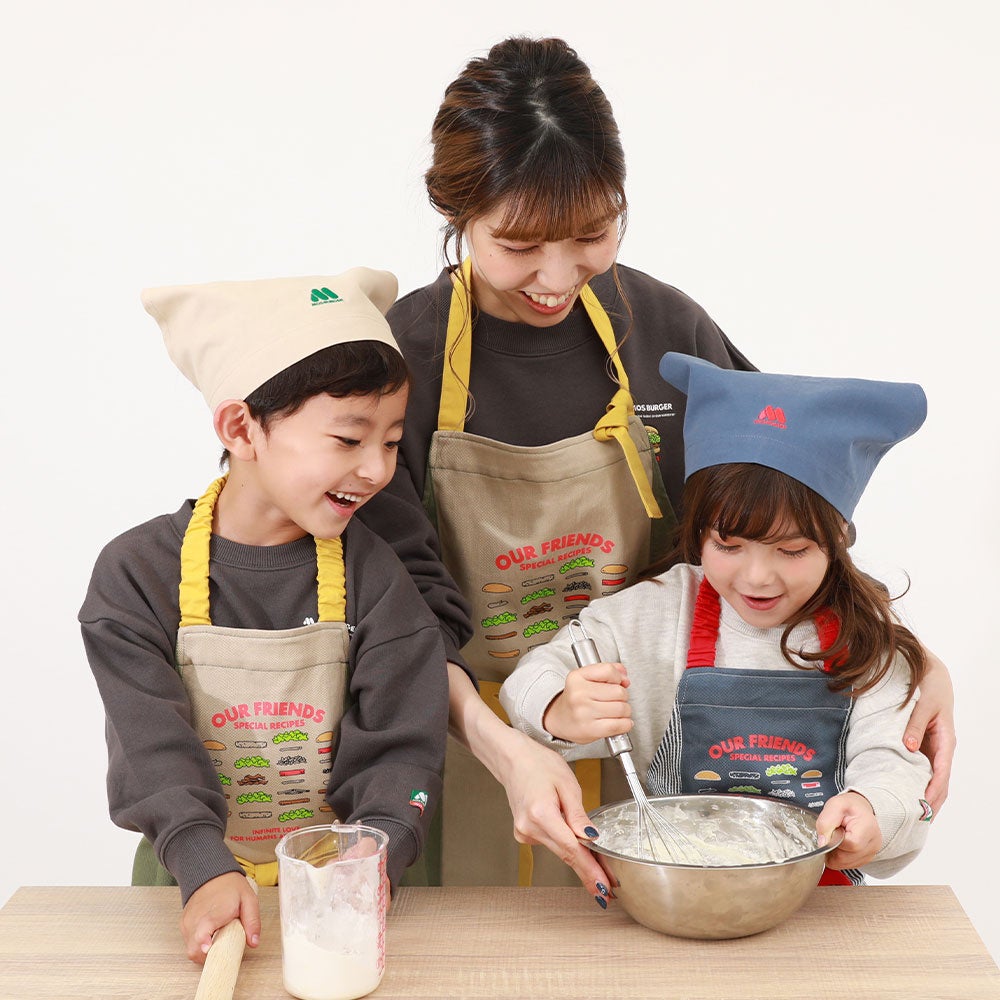 ・モスバーガーコラボ 防汚 キッズ ひとりでたためるエプロン 3点セット:size S-M(100-140cm) / ¥3,599(税込)