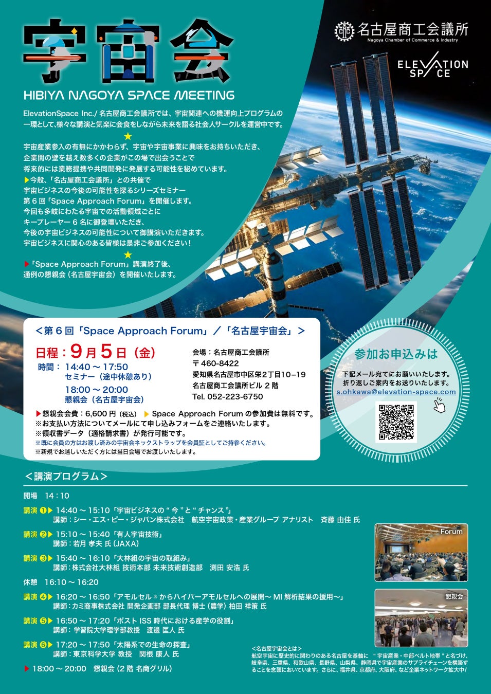 名古屋商工会議所と株式会社ElevationSpace は、宇宙産業の未来を探求する「第6回Space Approach Forum」を9月5日(金)に開催いたします。