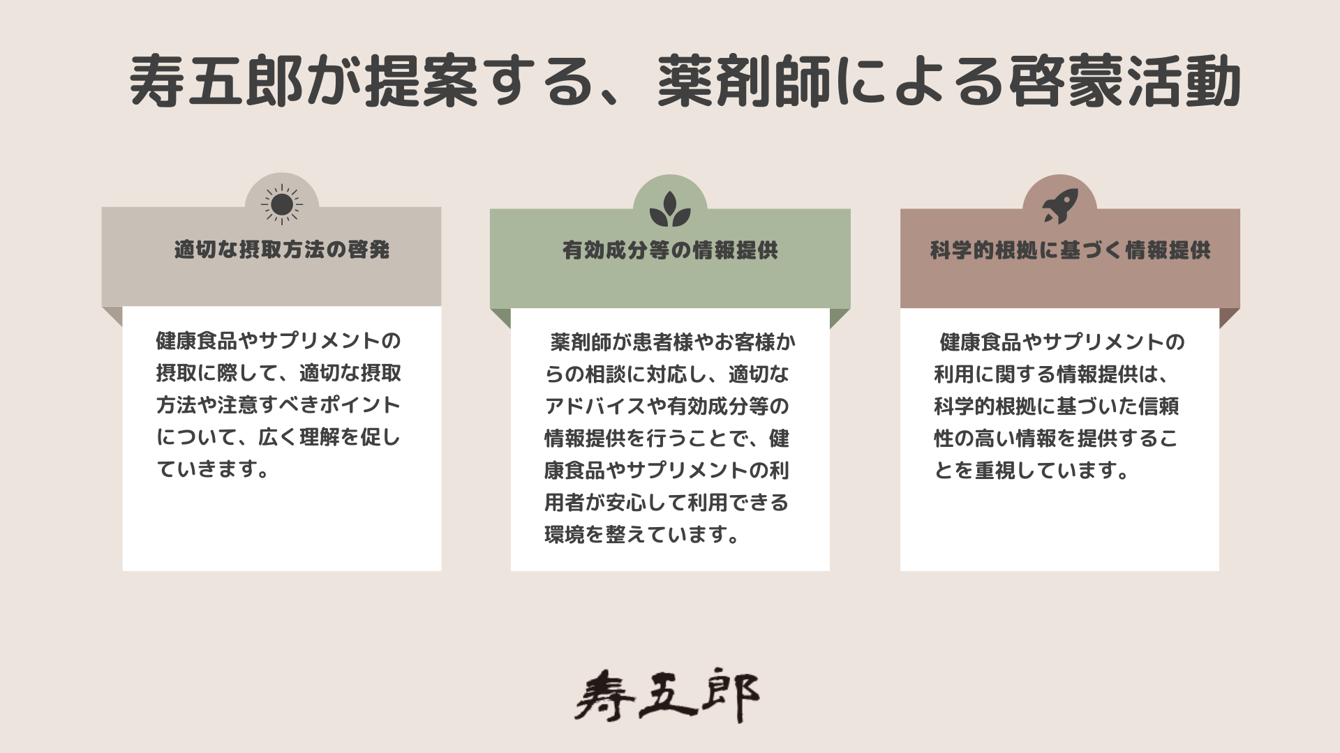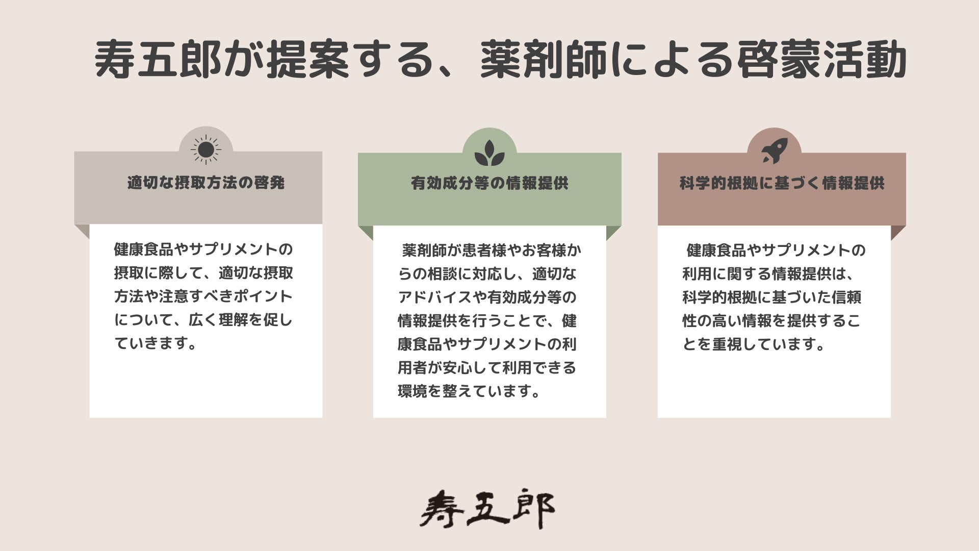 今後も寿五郎は、薬剤師専門の人材紹介という利点を活かし、健康食品やサプリメントのリスク軽減に向けた啓蒙活動を継続し、消費者の健康に寄与することを目指しています。