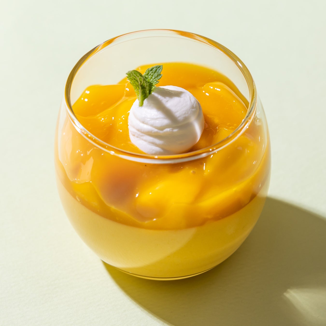 爽やかな酸味と濃厚な甘みをとじ込めたマンゴープリンの上に、アップルマンゴーの果肉とソースをトッピングしました。まろやかな口当たりで、甘みと酸味のバランスが絶妙です。
