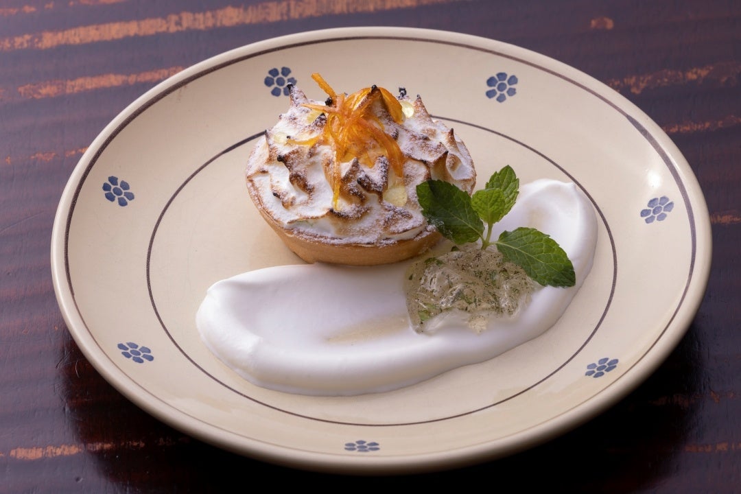 南イタリア産レモンのジュースを使ったクリームとイタリアンメレンゲのタルト。フワフワのレモンクリームとメレンゲ、サクサクのタルト生地の、甘み、酸味、さらに食感を楽しむ夏らしい爽やかなデザートです。白ワインとミントの心地よいジュレと共にお楽しみください。