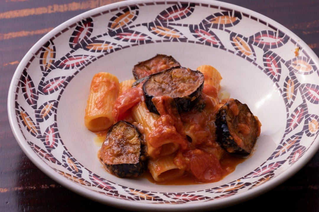 シチリア特産のリコッタ・サラータ(水抜きし、塩漬にしたリコッタチーズ)と、素揚げした茄子のパスタ。リコッタ・サラータは「ミルキーな塩」として使用され、特にトマトソースとの相性は格別です。「ノルマ」とは傑作オペラの名前で、シチリアでは「最高の」という意味で用いられます。