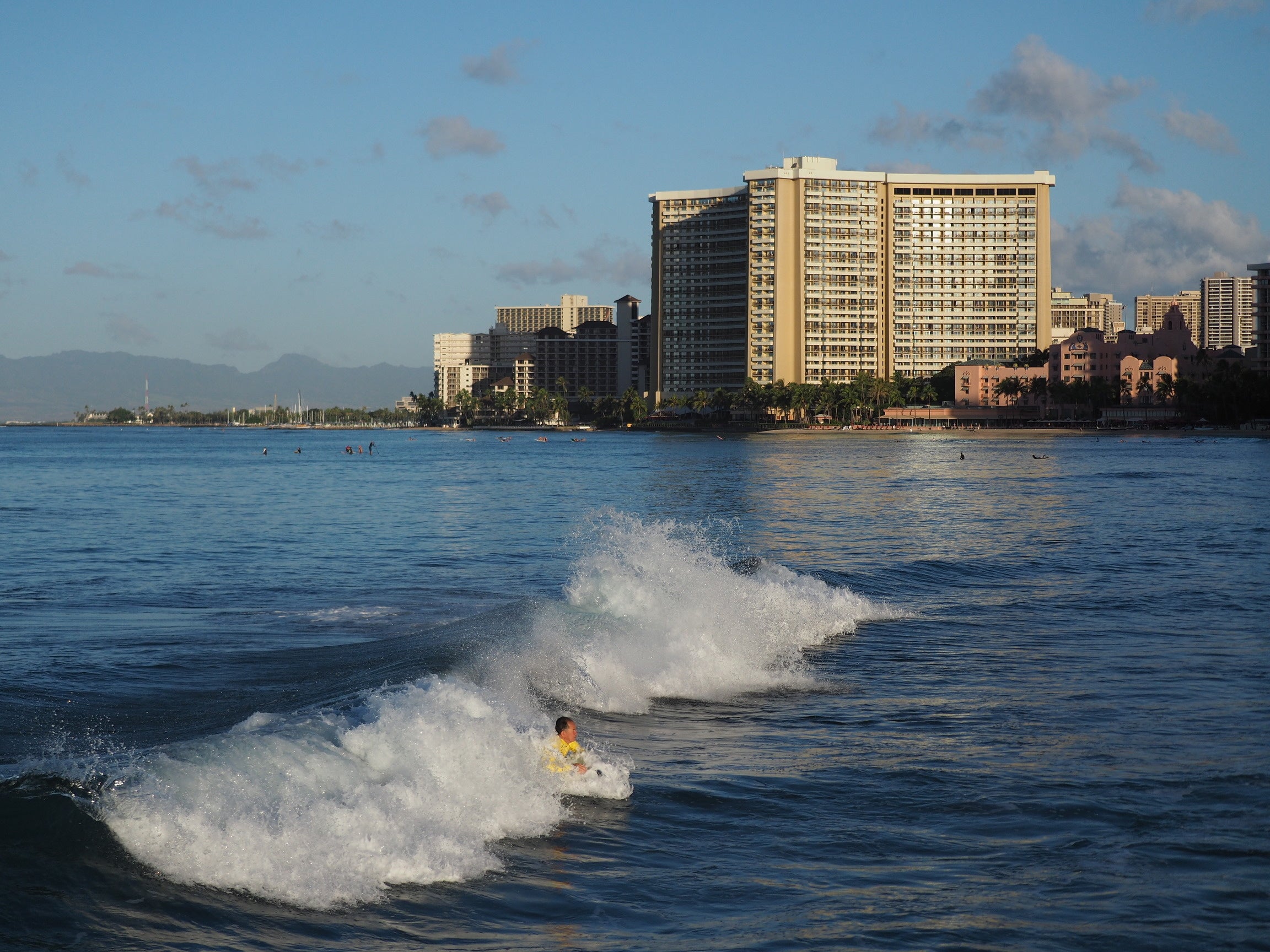 豊かな渓谷に囲まれた世界屈指のビーチが広がるハワイ(https://www.gousa.jp/state/hawaii)のオアフ島は、サーフィンの楽園で世界中のサーファーを魅了しています。活気ある都会と熱帯の島が交差する州都ホノルル(https://www.gousa.jp/destination/honolulu)は、サーフィン初心者にとって穏やかな波が広がるワイキキビーチ(https://www.gohawaii.jp/)を有し、ハワイ観光の出発点として最適です。ワイキキビーチの地平線にそびえる、ハワイの象徴的なダイヤモンドヘッド(https://gostateparks.hawaii.gov/diamondhead)まで足を延ばし、30万年前の噴火で形成されたダイヤモンドヘッドをハイキングしながら、壮大なクレーターを眺めることができます。サーフィン上級者には、巨大な波で有名なノースショアのハレイワがおすすめです。11月から2月にかけて、数々のサーフィンの大会が開催され、世界中のサーファーがビックウェーブに挑みます。ノースショア(https://www.gousa.jp/experience/oahus-north-shore-insiders-guide-wild-side-hawaii)では、ハワイ名物のシェイブアイス(かき氷)を1951年創業のMatsumoto Shave Ice(https://matsumotoshaveice.com/)でお楽しみいただけます。