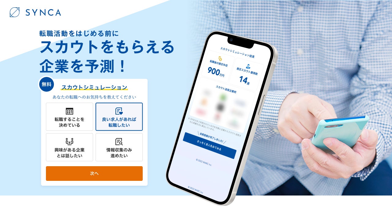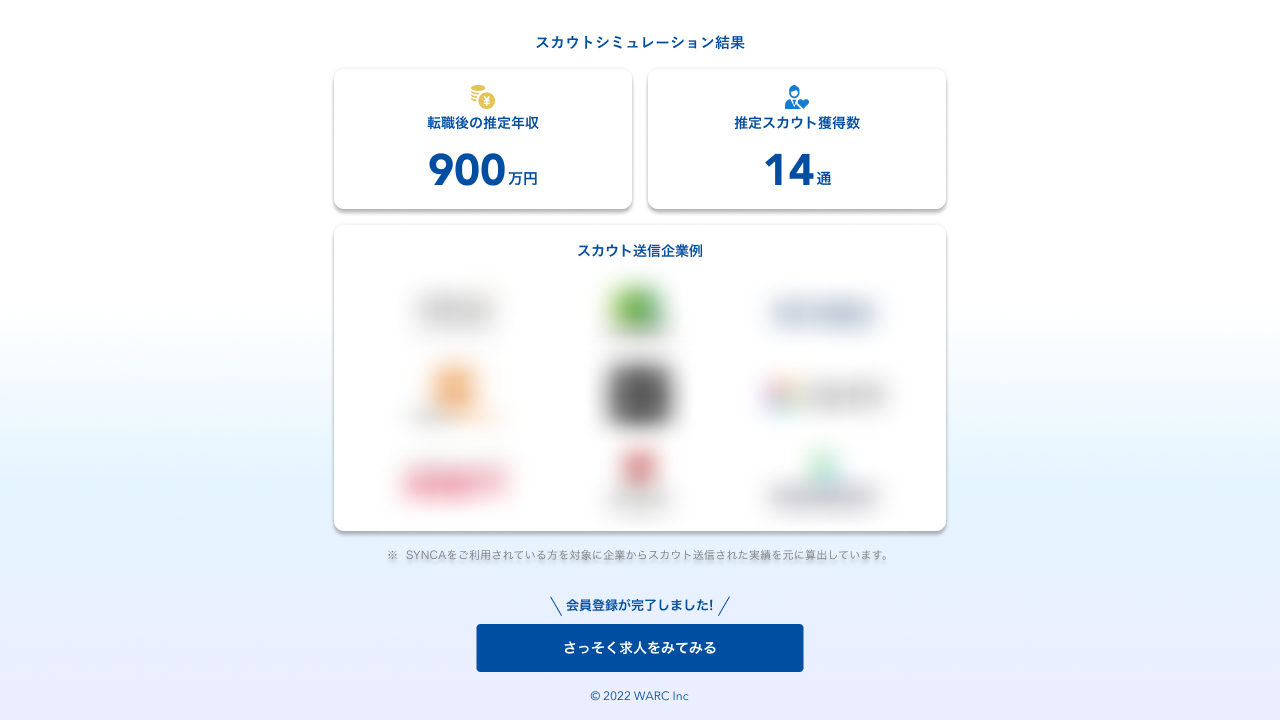 成長企業の経営管理支援事業を展開する株式会社WARC(本社: 東京都品川区、代表取締役社長: 山本 彰彦、以下「WARC」)は、管理部門特化の転職マッチングサービス「SYNCA(シンカ)」(https://synca.net/)にスカウトシミュレーション機能を追加しました。会員登録だけで、どんな企業からスカウトを受け取る可能性があるか、累計で何通のスカウトを受け取れるか、転職後の推定年収の予測が可能となります。