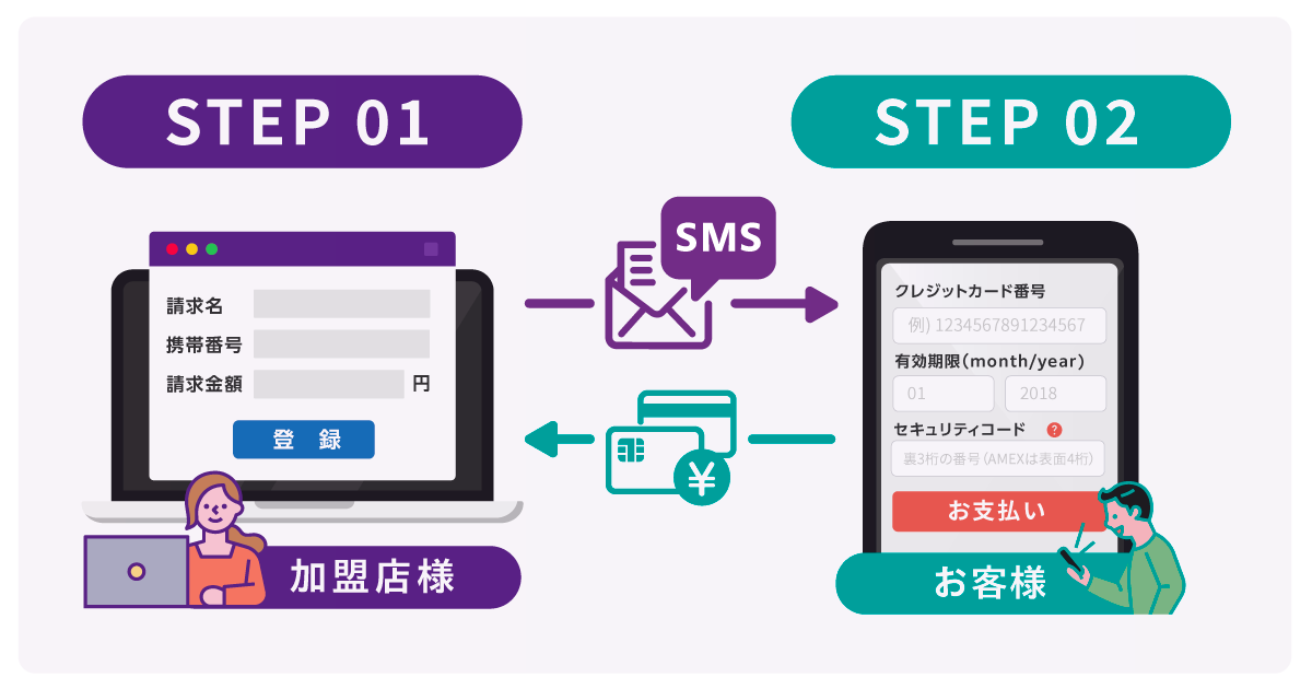 決済システム上で請求情報を作成後、ワンクリックでSMS送信が可能。電話対応中のリアルタイム送付にも対応します。