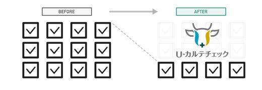 『U-カルテチェック』は、農業共済組合に提出されたカルテデータ(疾病名、稟告、投薬情報など)の内容整合性をシステムが自動でチェックすることで、審査担当者の確認工数を劇的に削減し、審査業務の標準化・効率化を支援するサービスです。