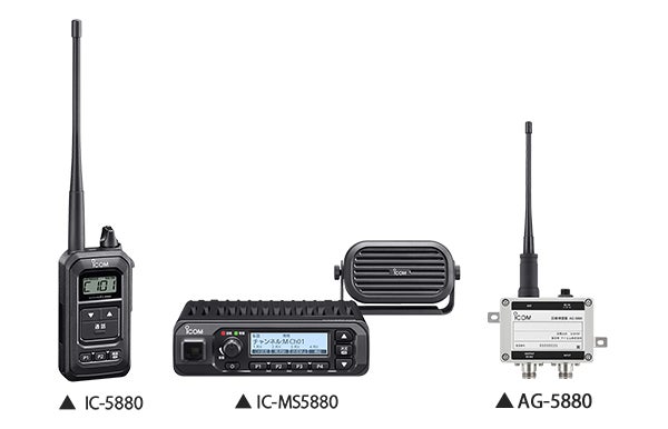 また、親機IC-MS5880(1台)と子機IC-5880(4台まで)で最大5者間の同時通話を実現します。親機間を相互接続ケーブルで連結することで、 最大9者間(親機1組・子機8台)による同時通話システムを構築。弊社従来機であるIC-MS4880/IC-4880との互換性を確保し、親機、子機のいずれかだけを従来機種と入れ替えることも可能です。