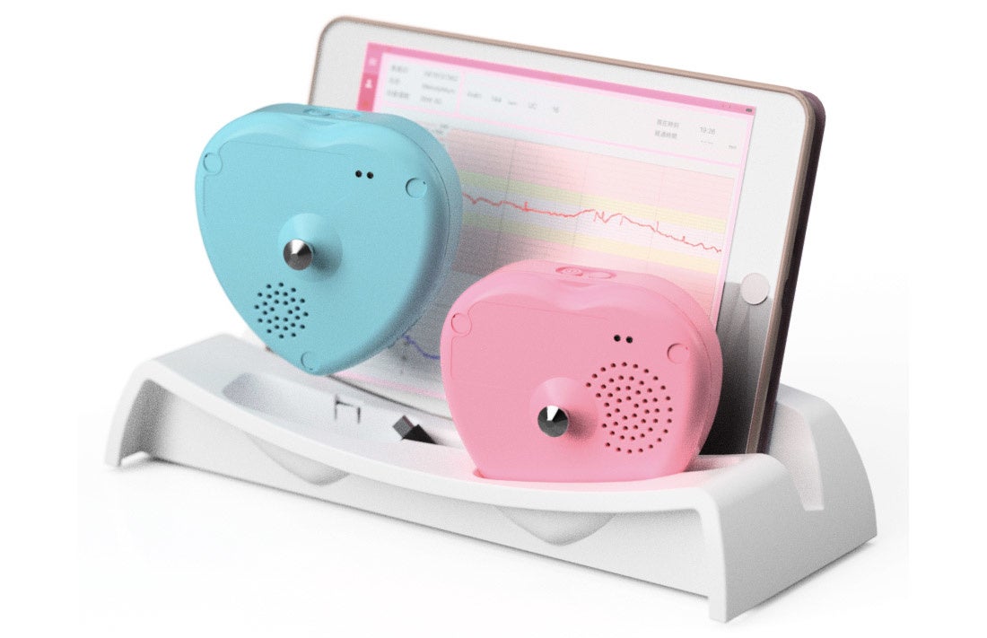 2018年5⽉にクラス2医療機器の認証を取得した医科向けの医療機器で、医師により診断に使⽤することが可能です。防滴性能を有しており、ケーブルレスなので、清浄や消毒が容易な医療機器です。また、医療従事者が直接接触しなくともその指導の下で、妊婦が自分自身で装着して、計測データはリモートで確認可能です。