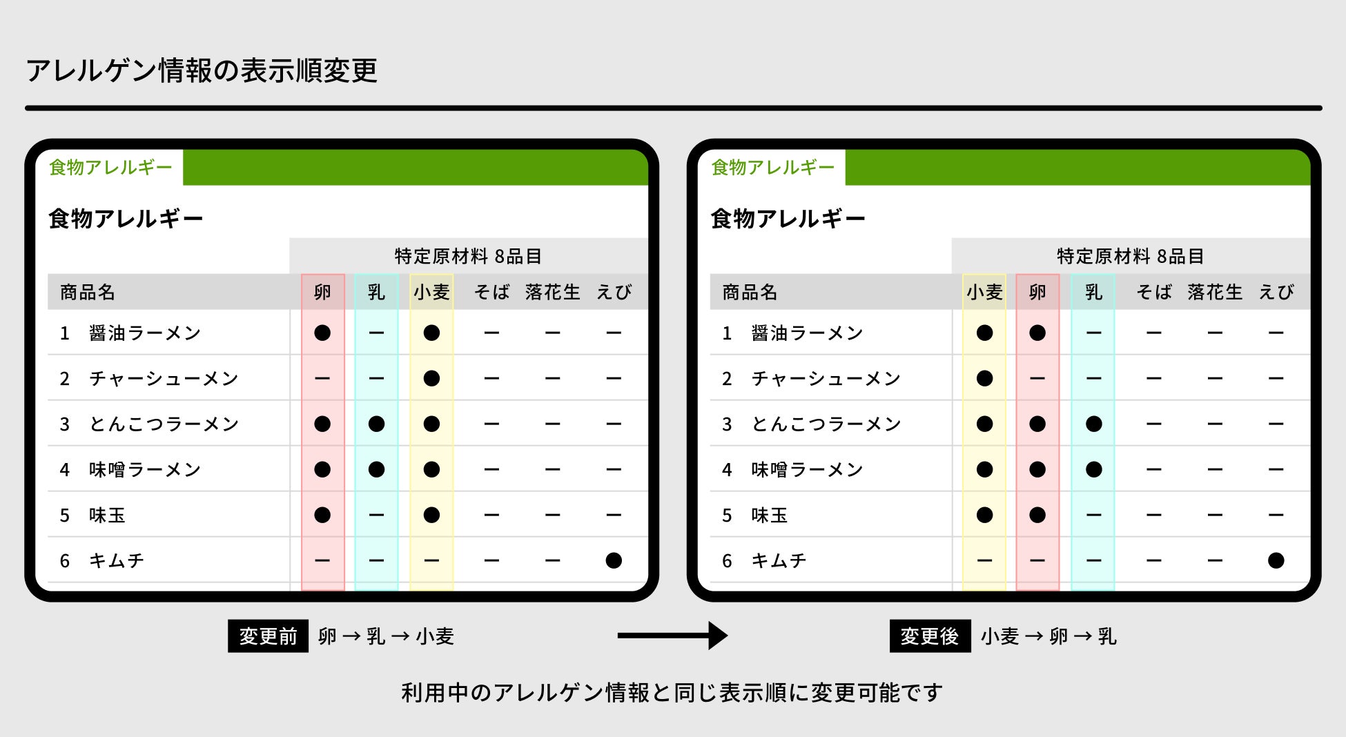 また、企業によって利用されているアレルゲン情報の並びは異なりますが、表示順の変更ができることで管理・設定が容易になります。