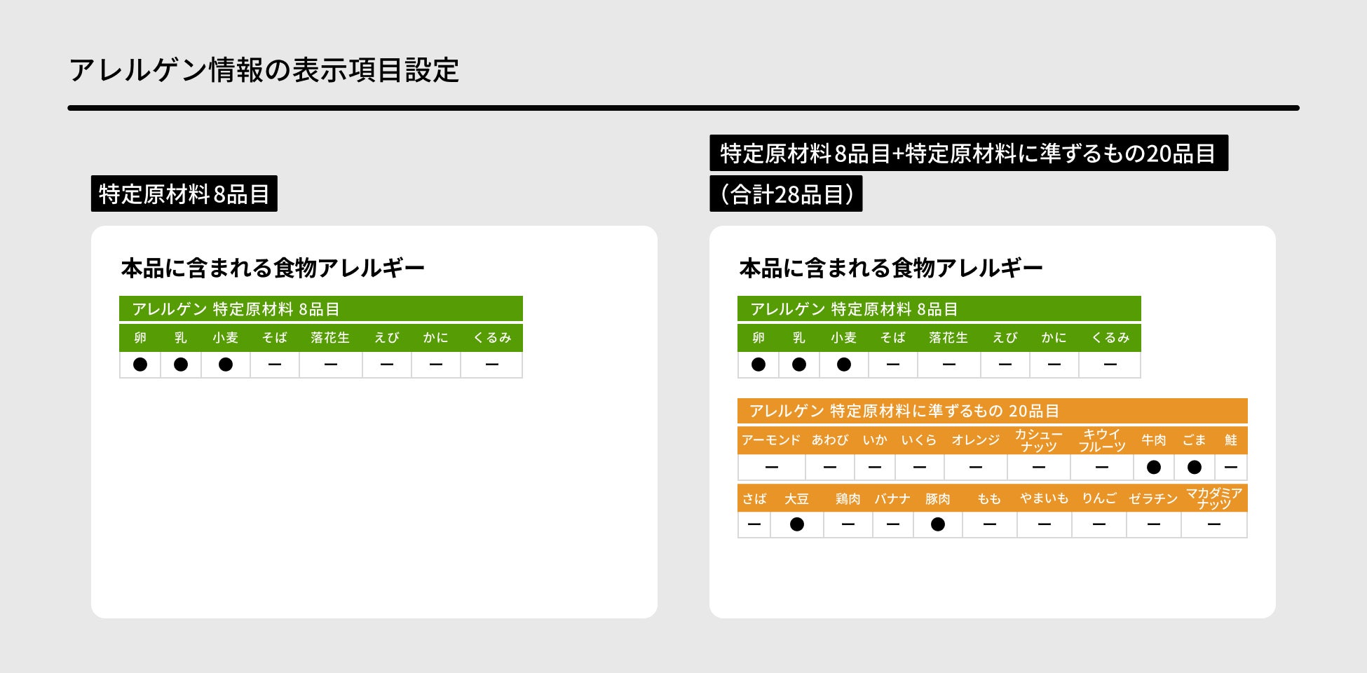 IGREKセルフオーダーの食物アレルギー表示機能は、メニューごとにアレルゲン情報を設定・表示できます。アレルゲン情報の表示内容は、「特定原材料8品目」または「特定原材料8品目+特定原材料に準ずるもの20品目(合計28品目)」の2パターンから選択できます。