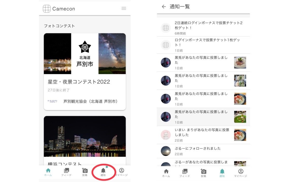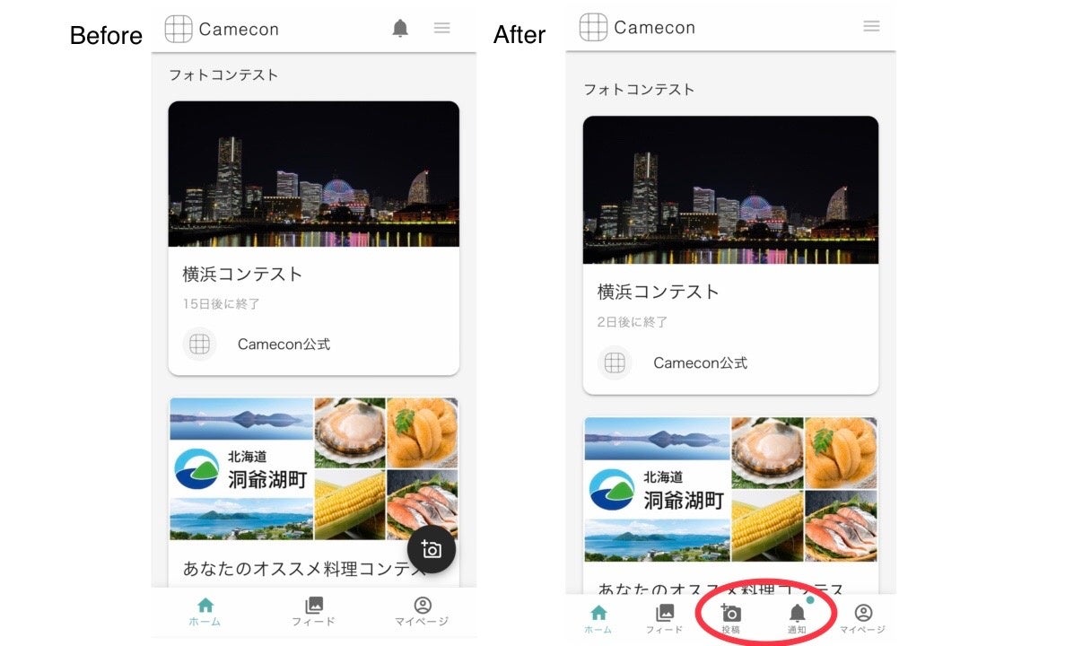 フォトコンテストアプリ「Camecon(カメコン)」のホーム画面のボトムナビに投稿・通知ボタンが追加されました。