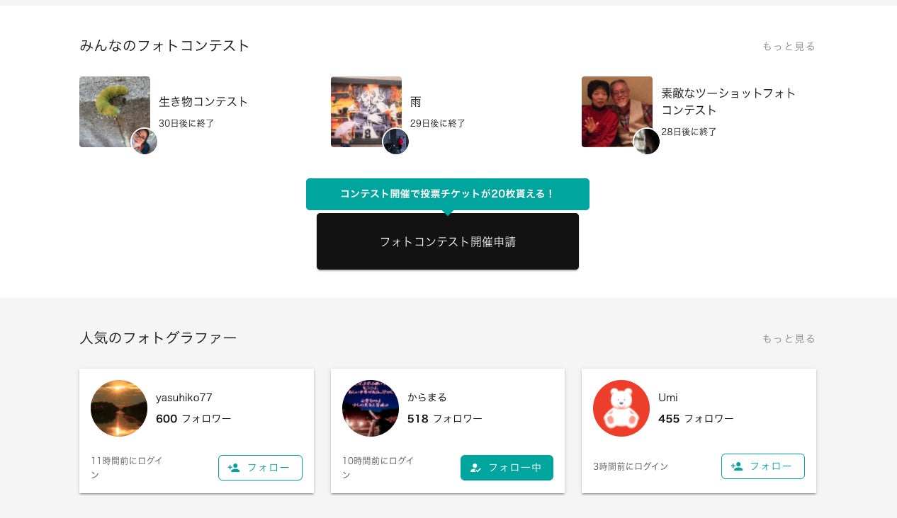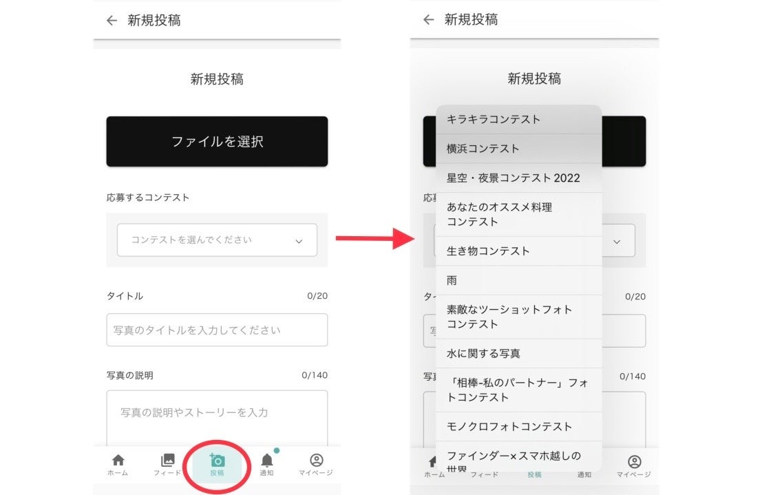 ホーム画面の真ん中にある「投稿」ボタンから、開催中のフォトコンテストに投稿できるようになりました。好きなコンテストのテーマを選び、画像を添付してフォトコンテストに応募してみてください。