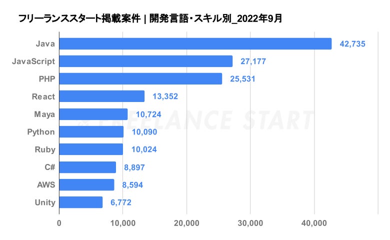 フリーランススタート調べにおける、開発言語・スキル別掲載案件数は汎用性の高い開発言語であるJavaが圧倒的に多いです。