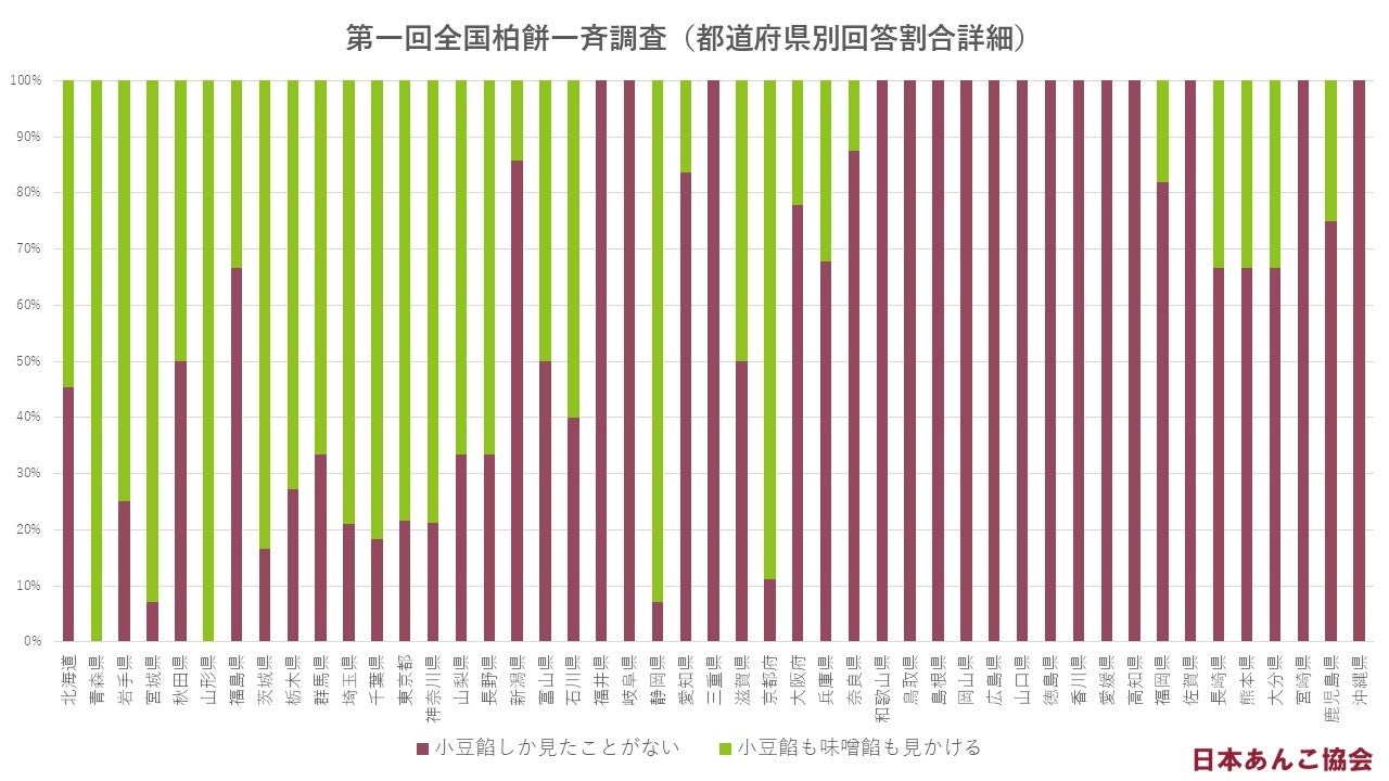 各都道府県において、「小豆餡しか見たことがない」と回答した人と「小豆餡も味噌餡も見かける」と回答した人の割合は以下のグラフの通りとなりました。なお、「味噌餡しか見たことがない」と回答した人はいませんでした。