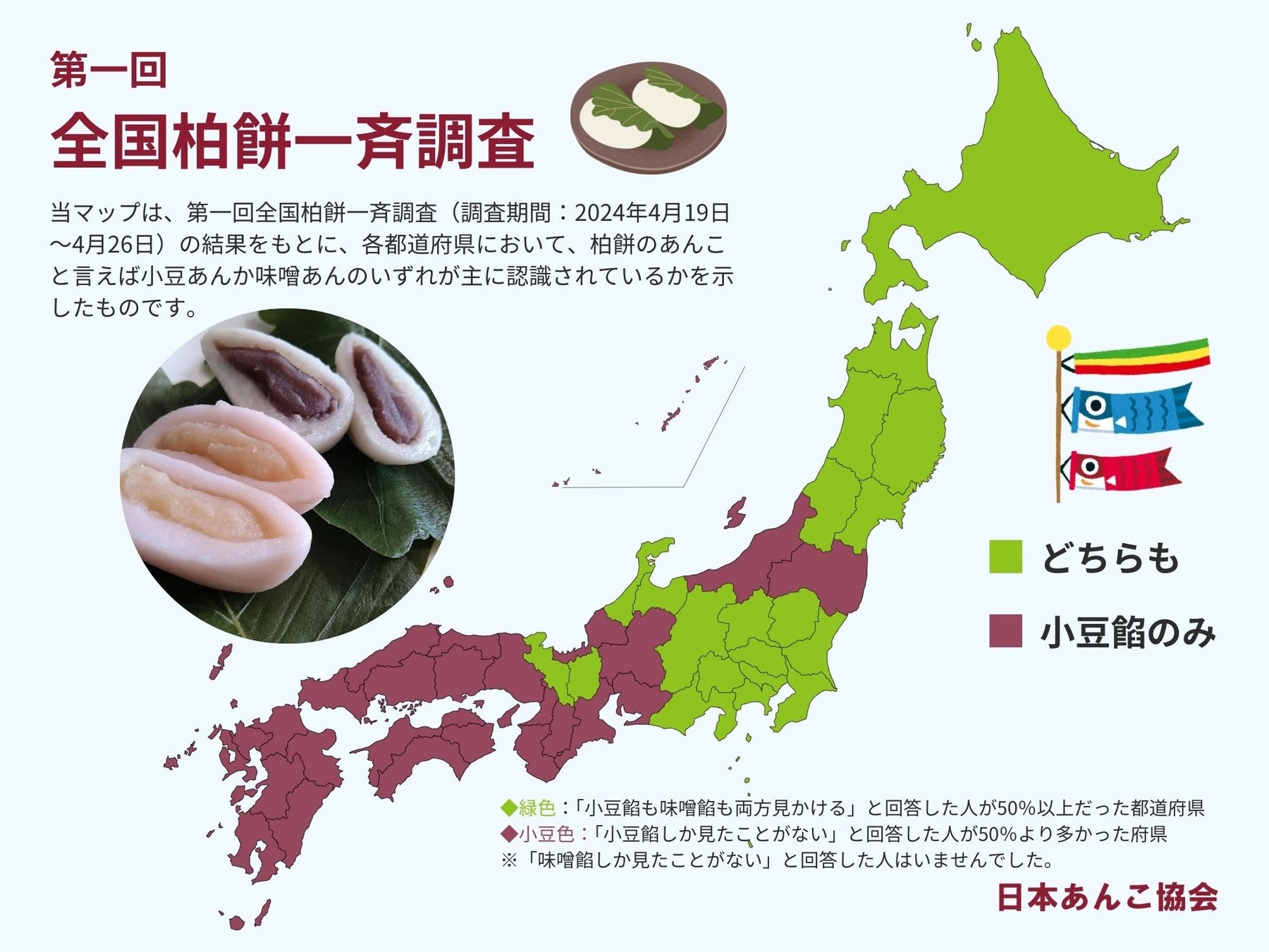 全国10000名を超えるあんこ愛好家団体が柏餅は小豆あんか味噌あんか都道府県別に一斉調査を実施
