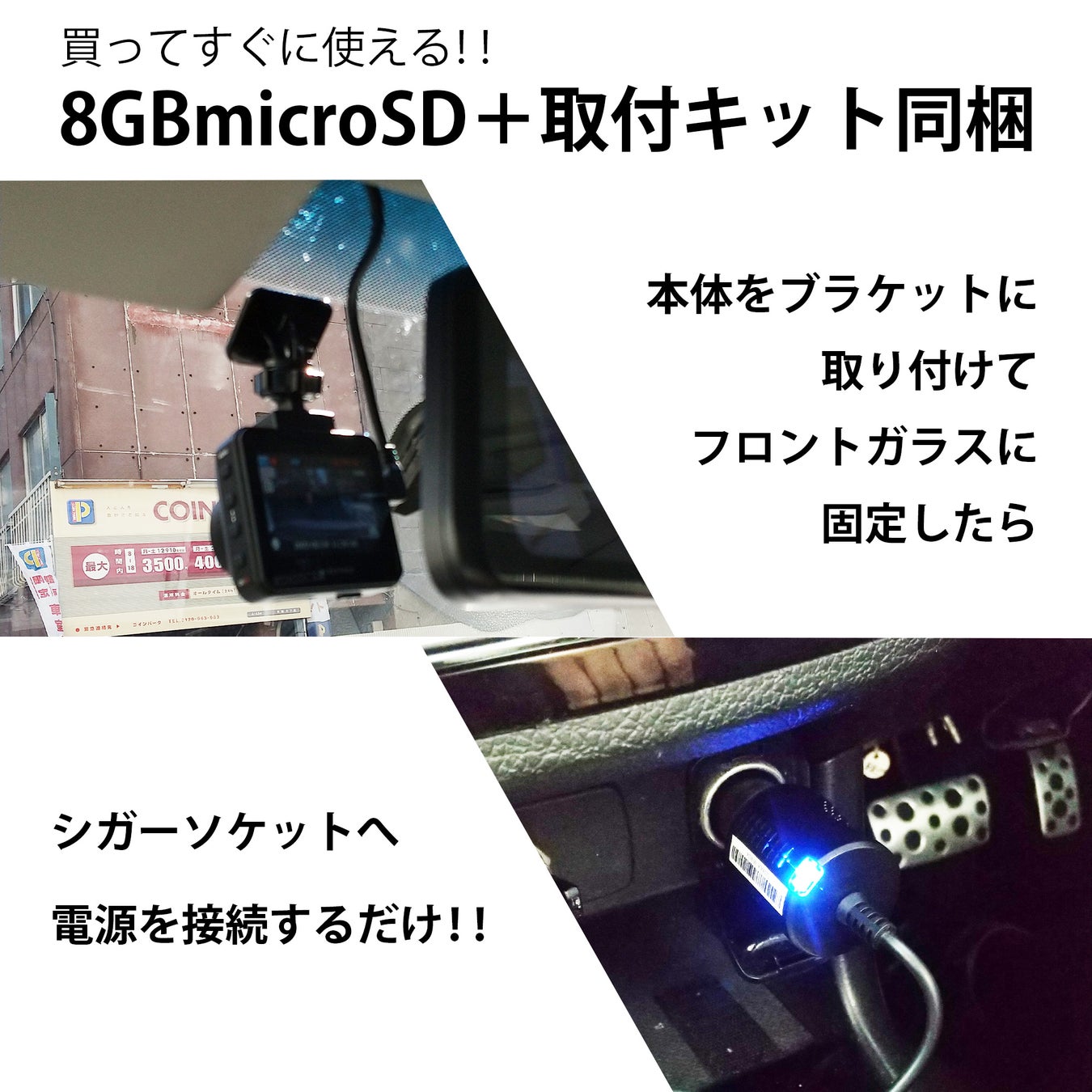 本体(ブラケット含む)×1、シガー電源ケーブル×1、MicroSDカード8GB×1(本体は128GBまでサポート可能)、取扱説明書(保証書付き)