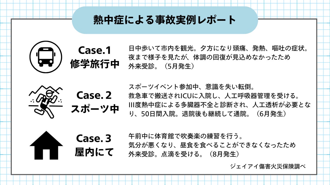 こうした調査結果から、熱中症は予防に加え、かかってしまった後の経済的なリスクまで含めて備えることが大切です。さらに当社では、実際に対策に取り組む学校へのヒアリングを通じて、教育現場における意識向上と、リスクに備える行動の促進活動に取り組んでいく予定です。