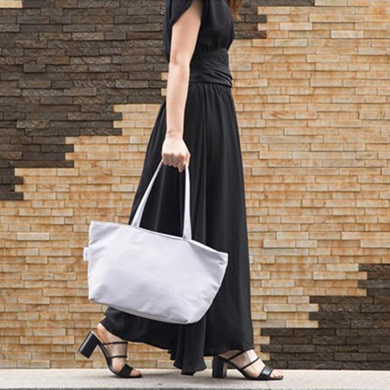 様々なシーンでお使いいただけるように、手触りの良い「アイスグレー」の生地を採用。ファスナーが付いており、A4サイズの書類や水筒も持ち運べるサイズで使い勝手が良いこともポイントです。
