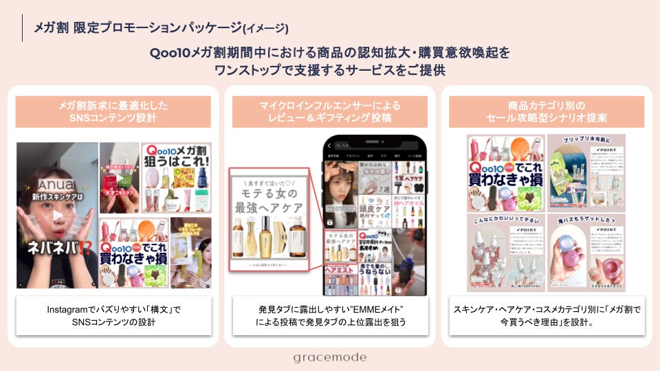 株式会社gracemode(本社:東京都目黒区、代表取締役:福家みのり)は、運営するSNS美容メディア「EMME」において、Qoo10の大型セール「メガ割」に特化した美容SNSマーケティングパッケージの提供を開始しました。