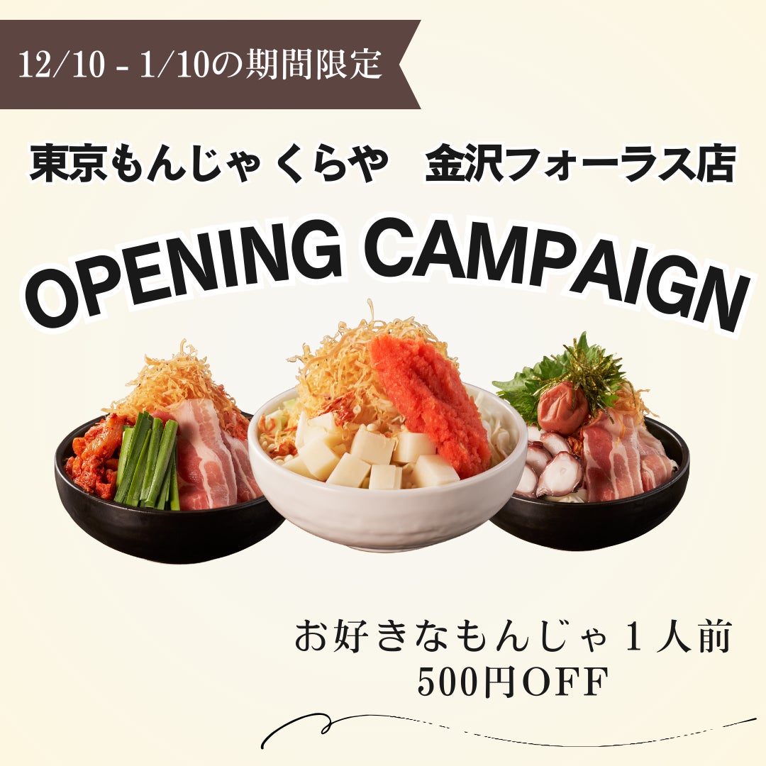 東京もんじゃ くらや 金沢フォーラス店では北陸初出店を記念して12/10~1/10までの1ヶ月間オープンキャンペーンを実施いたします。