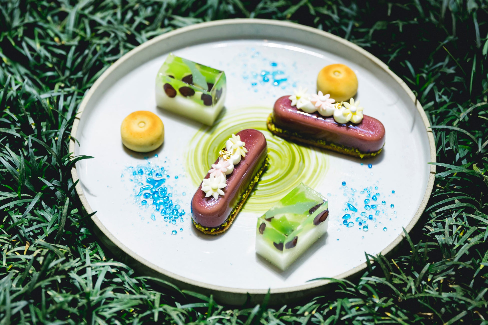 亀屋良長の青紅葉の緑と透明感がすがすがしい羊羹「貴船川」、甘酸っぱく爽やかな香りと白あんが初夏を感じる焼菓子「満々 甘夏とレモン」をはじめ、 ペストリーシェフによる不思議の国のアリスにインスパイアされたフラミンゴや赤いチェリーが女王を象徴したクイーンチェリ―メレンゲ、庭のデコレーションで初夏のガーデン ワンダーランドを表現したブラックベリーハイビスカスなどのワクワクするようなスイーツが揃います。