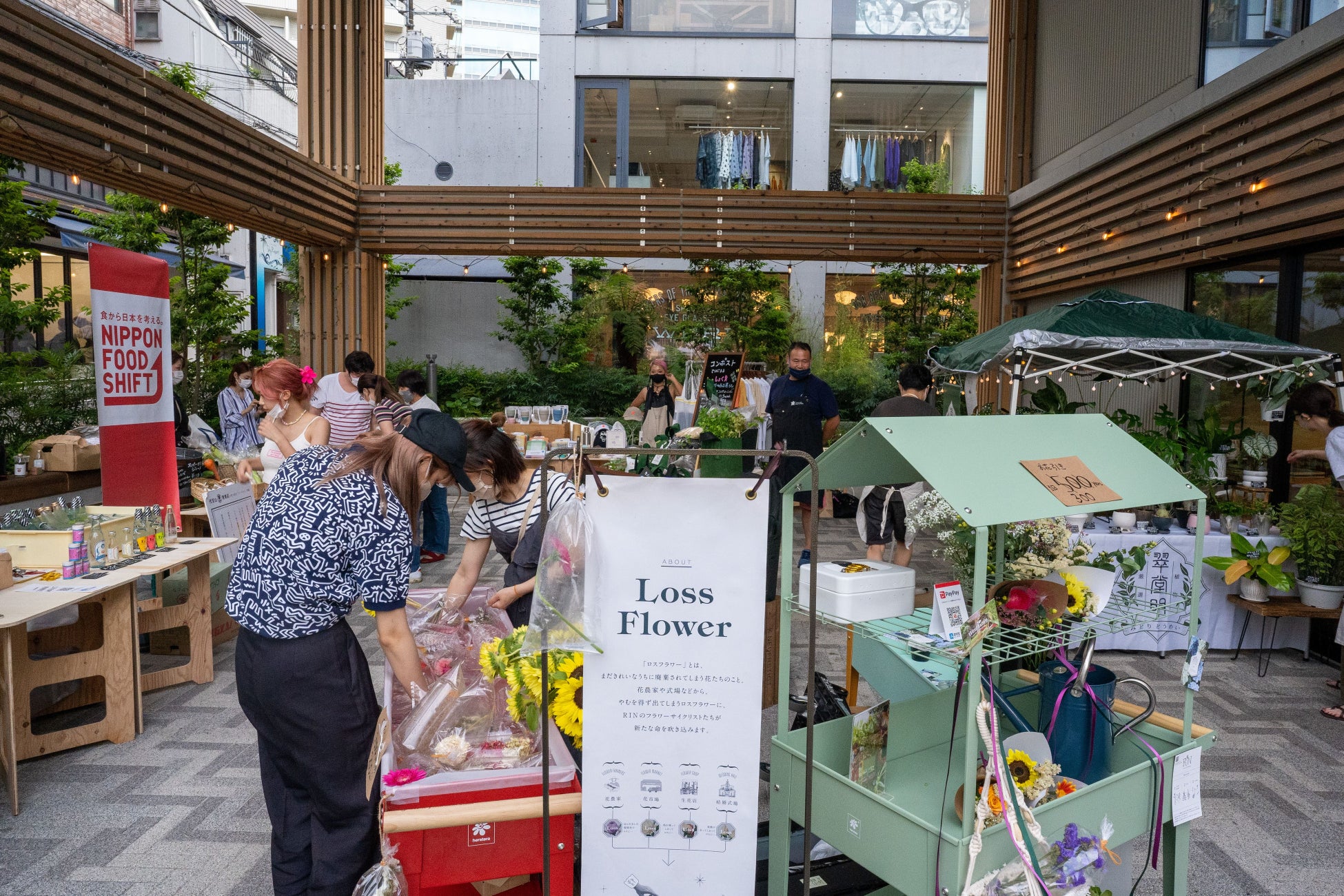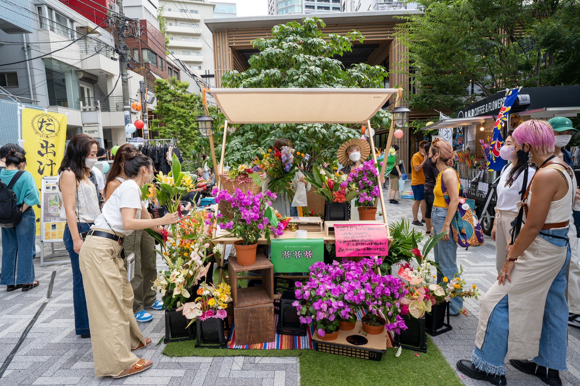 さらに、かねてから渋谷のストリートカルチャーを盛り上げてきた石川涼さんが手掛けるアパレルブランド「#FR2」の移動販売店舗「#FR2DOKO?」の出店が追加決定。また、神南エリアのモデル事務所「バークインスタイル」がプロデュースするフリーマーケットには、所属モデルの影山 友哉さんやヘア&メイクアップアーティストの石田浩康さん、人気ブランドを手掛けるファッションディレクターらが一点モノのプライベート古着を出品するほか、帽子を中心に展開する雑貨ブランド「MOA」や海外の絵本専門店「yack yack books」や観葉植物と鉢のセレクトショップ「翠堂明」、ロスフラワー専門店「RIN」など、ここでしか出会えない感度の高い店舗や人がそろいます。また、神南に位置する吉本興業のコワーキングスペース「ラフアウト渋谷」の協力により、お笑い芸人のネゴシックスが来場し、アパレルの販売も実施。