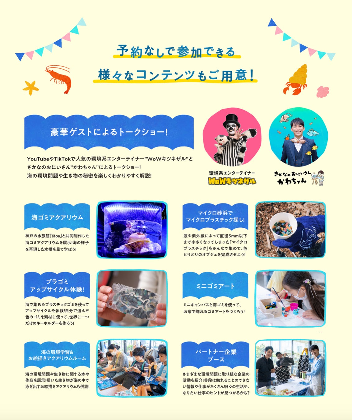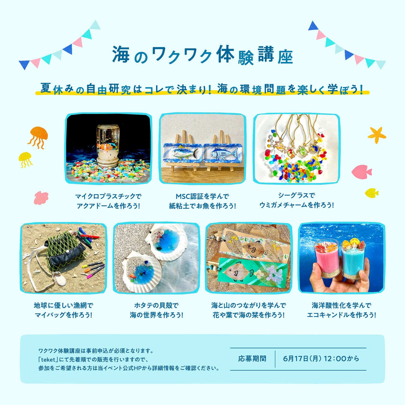 海のごみの約8割を街から流れ出たごみが占め、プラスチックごみは海の中で400年も漂い、海を汚染するだけでなく生き物にも被害を及ぼすなど、こうした問題の原因は私たち人間であり、海を守るために一人一人の意識を変えていかなければならない段階に達しています。そうした中、これからの未来を担う子ども達が環境問題を身近に捉え、楽しみながら学べる機会を提供すべく、海の環境問題と夏休みの自由研究を掛け合わせた「海の自由研究フェス」を2018年よりスタートしました。6回目の開催となる今年は原宿駅前の複合型商業施設 WITH HARAJUKU 3階のホールをメイン会場とし、海のワクワク体験講座(ワークショップ)や、スペシャルゲストによるトークショー、迫力ある海ゴミアクアリウムやアップサイクル体験など、五感を使って楽しく学べる様々なコンテンツをラインナップしました。