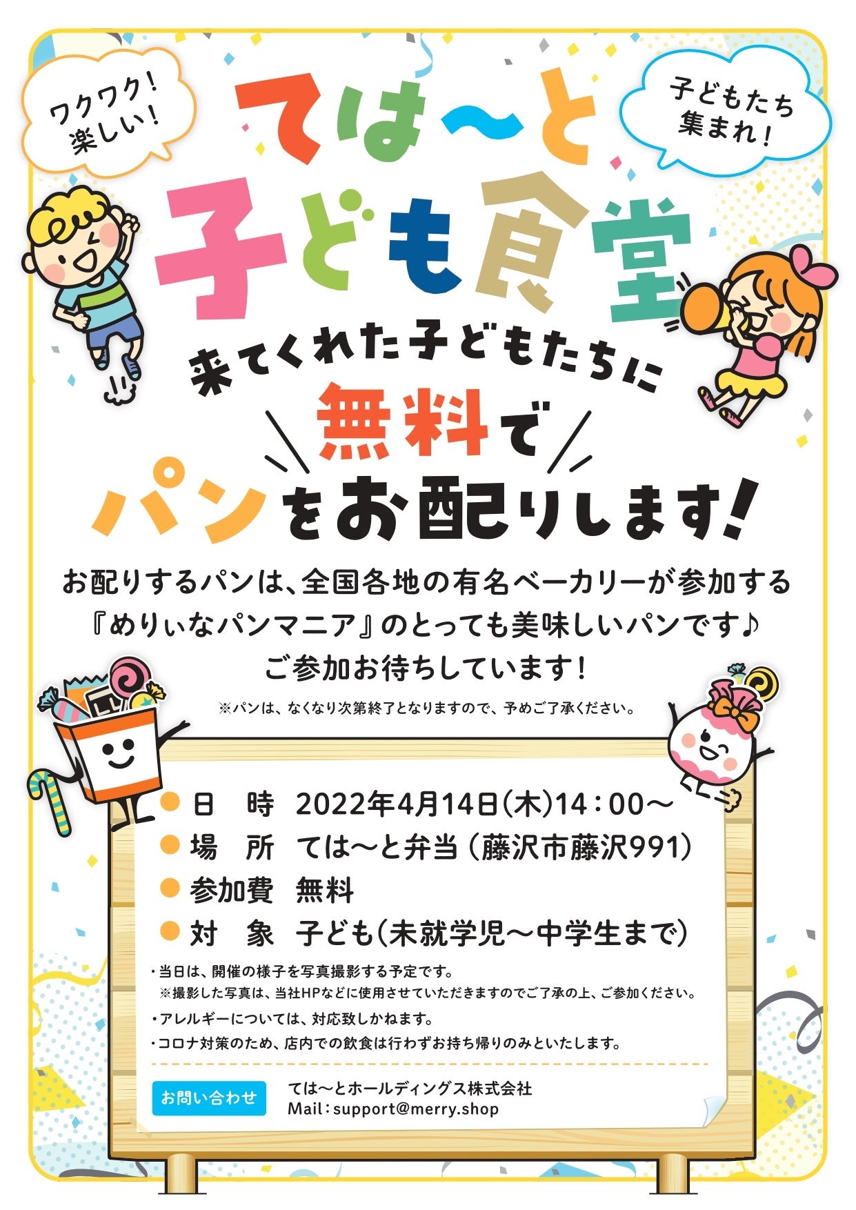 お取り寄せECサイト「めりぃさんのお店」を運営するては~とホールディングス株式会社(代表取締役社長 兼 グループCEO:後藤 康太 以下、当社)は、コロナ禍で加速している子どもの貧困、働くママの負担増の問題を受け、パンの定期配送サービス「めりぃなパンマニア」を通して子ども食堂、ひとり親家庭サポートの取り組みを開始しました。