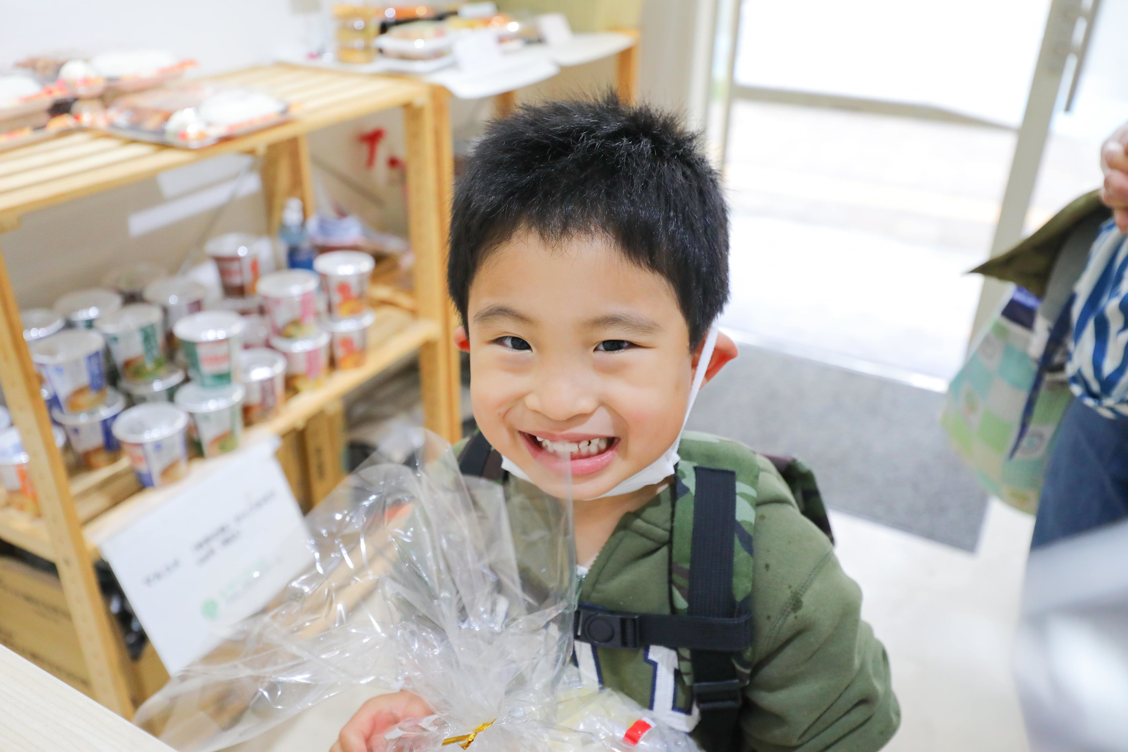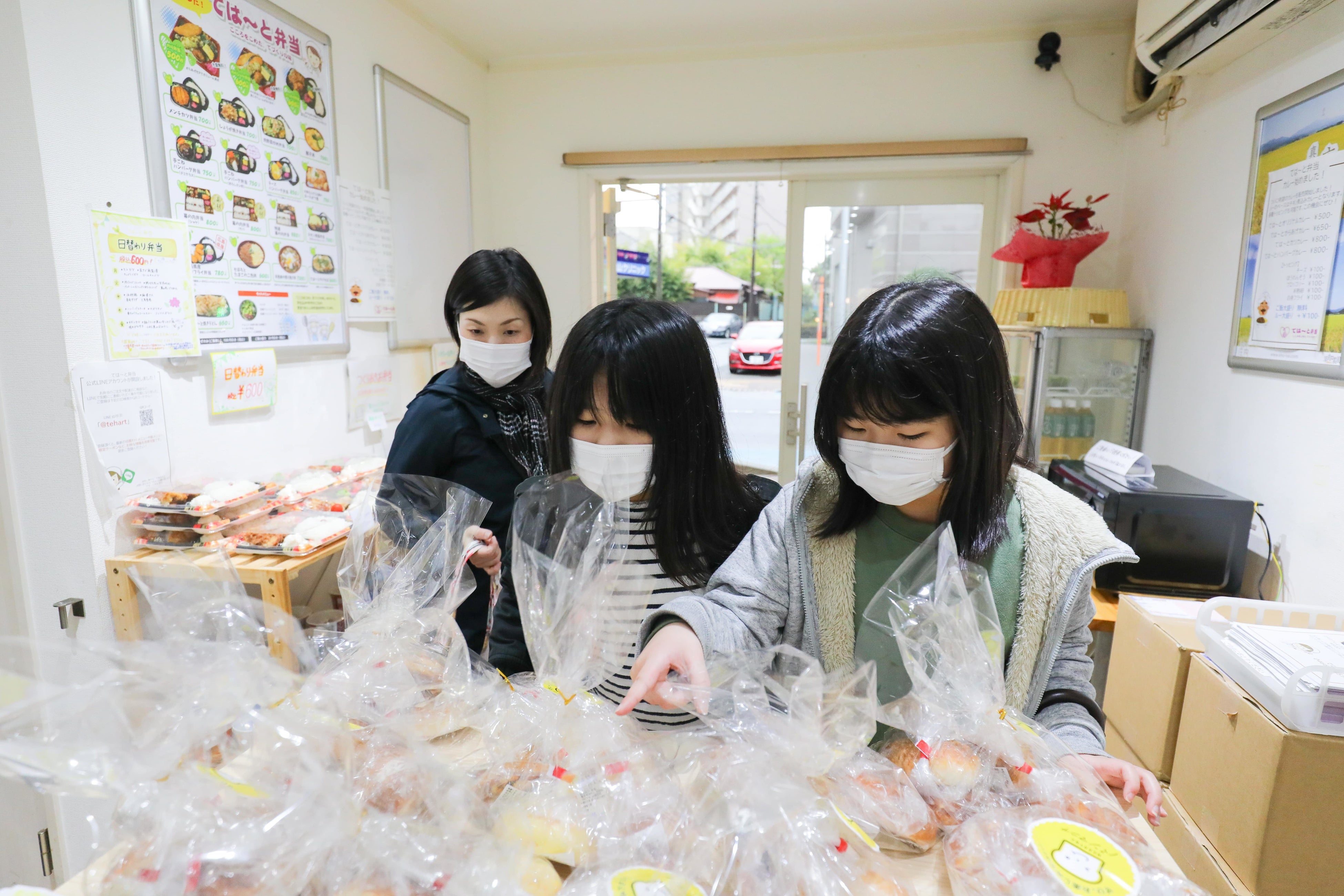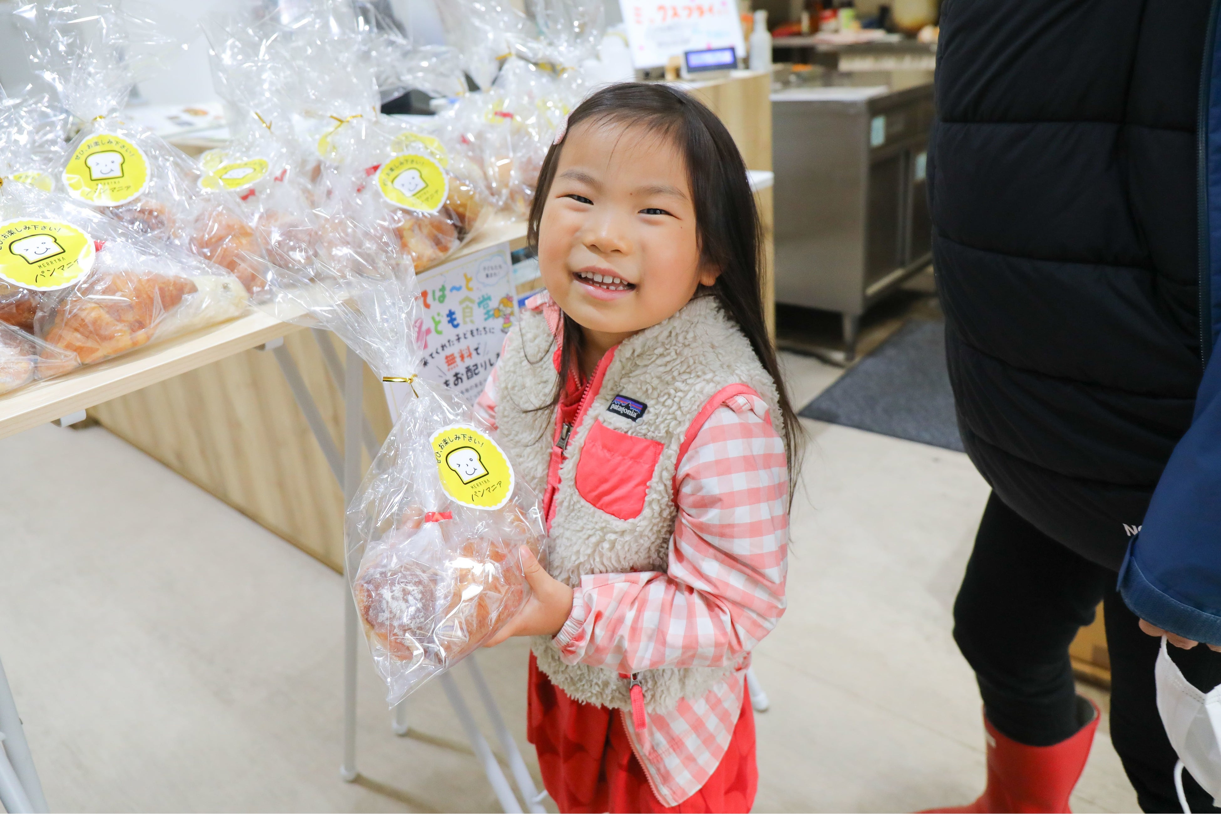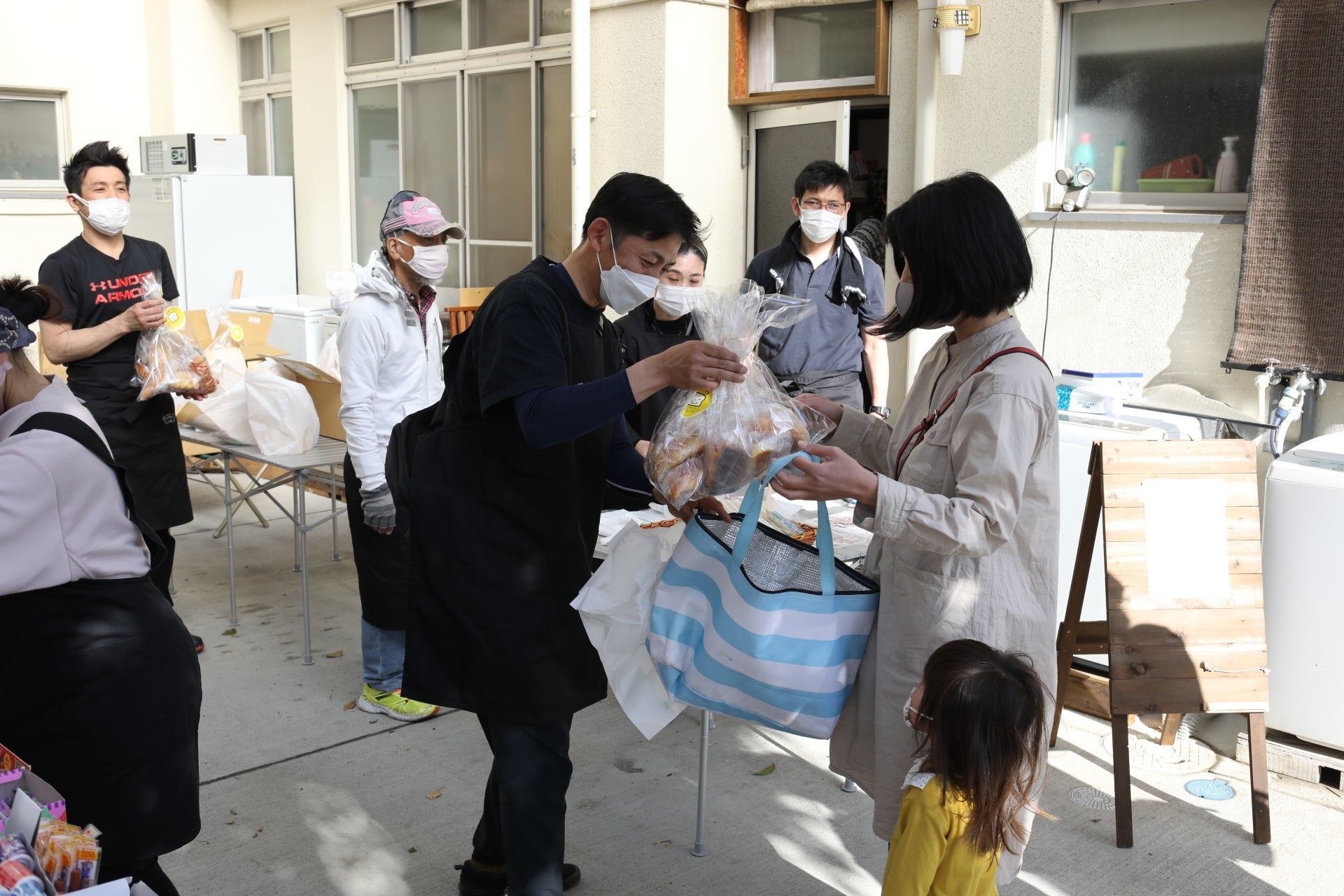 普段はお弁当を買ってくださるママさん達がお子さんを連れてきて、パンやお菓子を受けとってくれ、子どもたちの笑顔が印象的でした。
