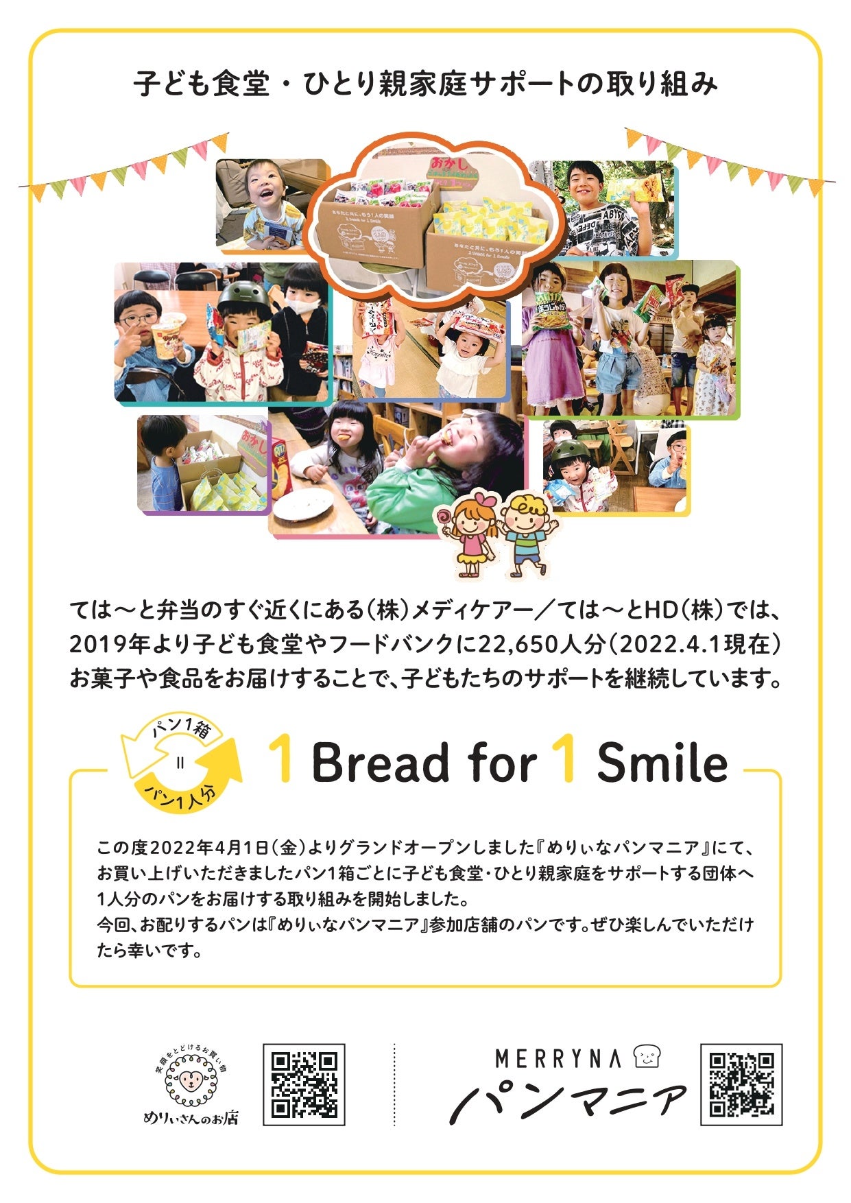 「1Bread for 1Smile」と題し、めりぃなパンマニアが1箱購入されるたびに、子ども食堂とひとり親家庭をサポートする団体へパン1人分をお届けします。