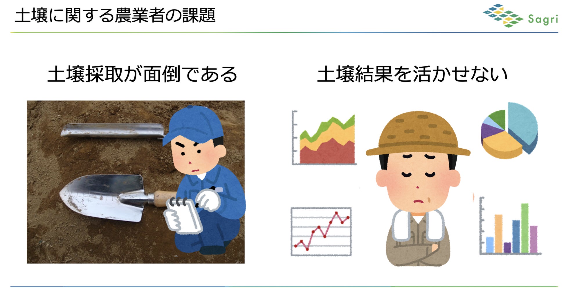 本日のテーマは「土壌化学性指標の広域センシング把握による最適な施肥設計とカーボンニュートラルの実現」という題でお話をさせていただきます。弊社は衛星データなどのビックデータを農学(Agronomist)の視点とAI(DataScientist)の両面から解析をし、農業現場の情報の再現を目指しています。特に、リモートセンシング分野における土壌データの解析はまだ国内含め実利用が少なく、創業当時より着眼をしてまいりました。兵庫県丹波市を拠点に、農業現場を回りながら親しくしている農家から話を聞いていると、土壌採取は圃場から5箇所程度を採取し、試薬を用いて化学性指標の解析をされていました。特に有機農法に力を入れている農家は土壌をより把握し、対処をしていましたが、現場ではいくつか課題がありました。それは、この土壌採取及び試薬を用いた解析がかなり農家の負担となっていることです。農家は本来全ての土壌状態を把握したいのですが、それをしている余裕はなく、部分的に農地の土壌を調べていました。また、自分で解析をせず、外部に解析委託をしている農家にも出会いました。しかし、解析結果が戻ってきても、その結果に対する施肥設計ができないことや、そもそも結果が帰ってくるのが遅く、現場の施肥に反映できない等、潜在的な課題を抱えていました。