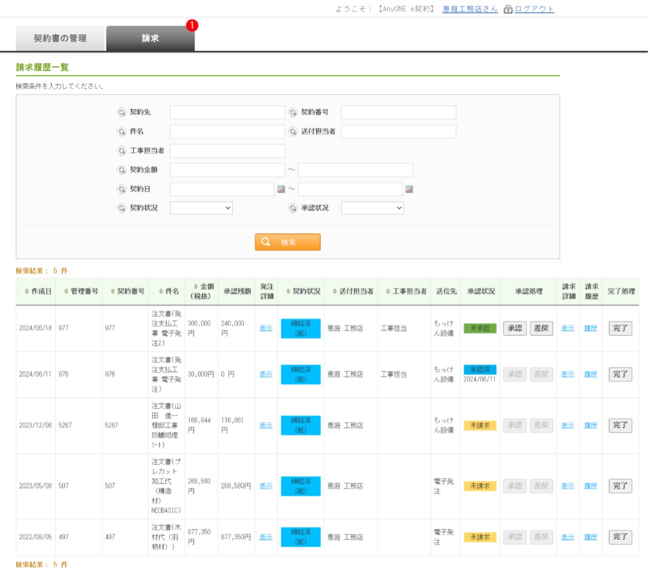 工事後の請求は、元請け会社にはメールで通知され、専用ウェブサイトで工事の発注データに紐づいた請求内容を確認できます。請求内容の確認だけでなく、請求承認や差し戻しも可能です。