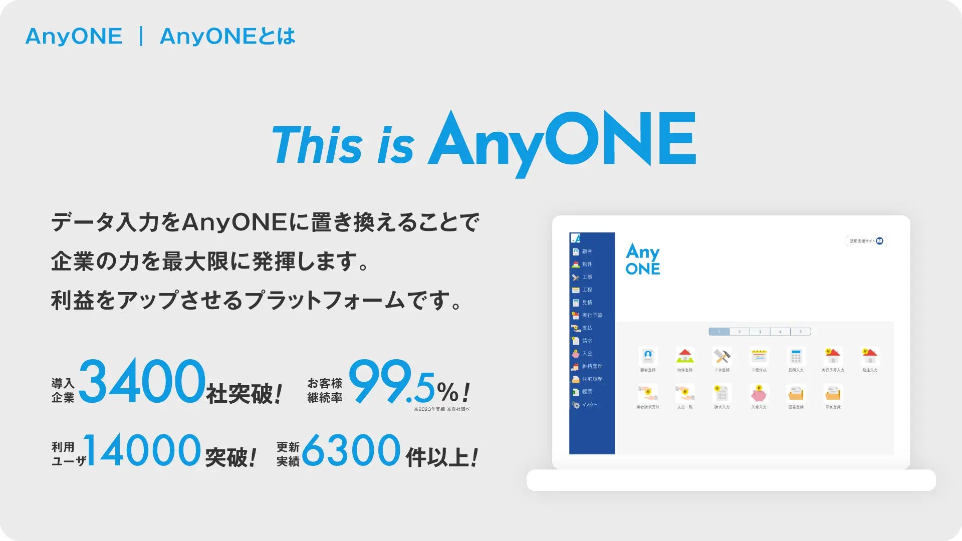 「AnyONE」は、工務店や住宅会社向けの管理システムで、顧客管理や物件・工事の管理はもちろん原価・粗利の管理までの業務を一元管理できる経営サポートツールです。「AnyONE」は2010年にリリースされ、表計算ソフトのような使いやすさにこだわった開発と、導入・活用に対する徹底したサポートを提供しています。その結果2024年現在の導入社数は3,400社を超えています。