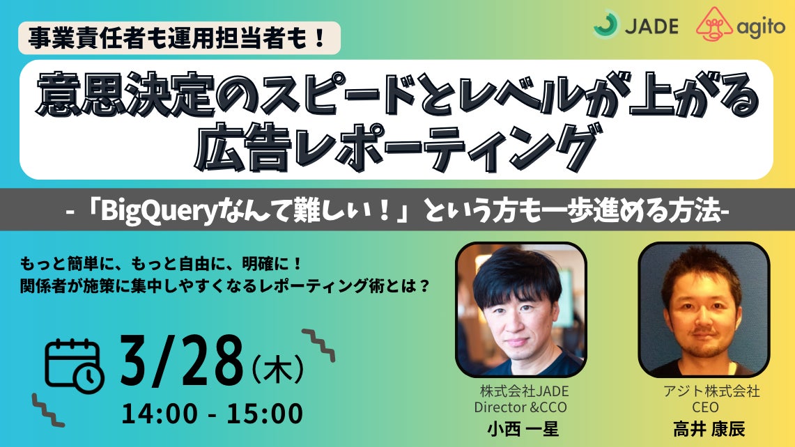 株式会社JADEが3月28日(木)に開催する無料ウェビナー「事業責任者も運用担当者も意思決定のスピードとレベルが上がる広告レポーティング〜BigQueryなんて難しいという方も一歩進める方法〜」に、アジト株式会社(東京都千代田区、代表取締役:高井 康辰、以下アジト)の高井がゲストとして登壇いたします。